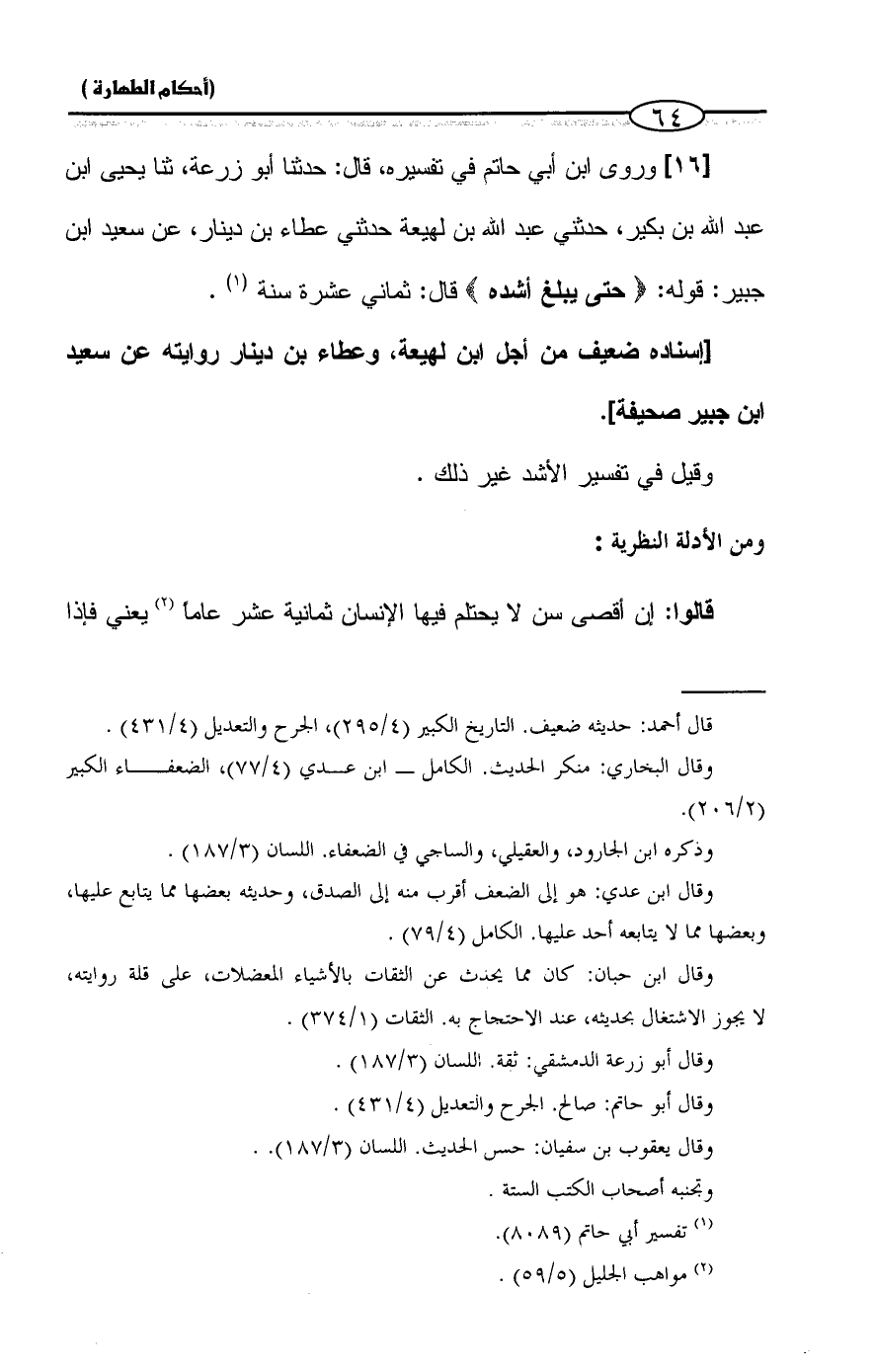 [١٦] وروى ابن أبي حاتم في تفسيره، قال: حدثنا أبو زرعة، ثنا يحيى ابن عبد الله بن بكير، حدثني عبد الله بن لهيعة حدثني عطاء بن دينار، عن سعيد ابن جبير: قوله: {حَتَّى إِذَا بَلَغَ أَشُدَّهُ} قال: ثماني عشرة سنة (¬١).