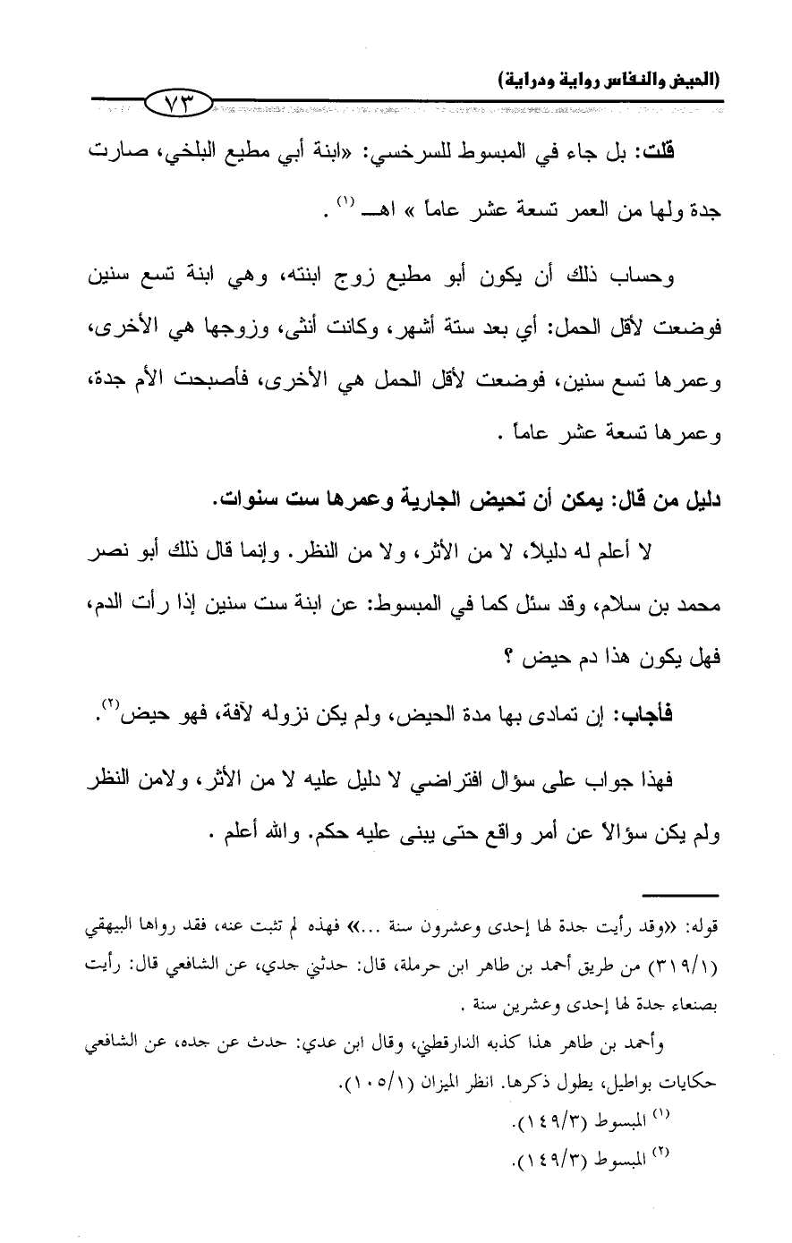 قلت: بل جاء في المبسوط للسرخسي: "ابنة أبي مطيع البلخي، صارت جدة ولها من العمر تسعة عشر عاماً" اهـ (¬١).