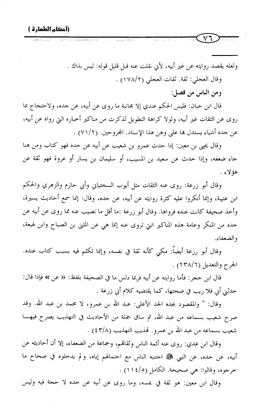 وقال يحيى بن معين: إذا حدث عمرو بن شعيب عن أبيه عن جده فهو كتاب ومن هنا جاء ضعفه، وإذا حدث عن سعيد بن المسيب، أو سليمان بن يسار أو عروة فهو ثقة عن هؤلاء.