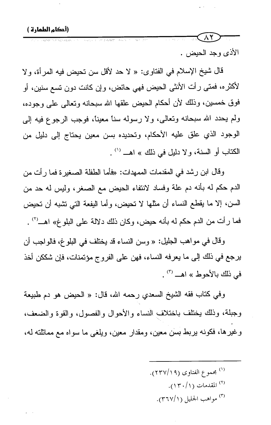 وفي كتاب فقه الشيخ السعدي رحمه الله، قال: "الحيض هو دم طبيعة وجبلة، وذلك يختلف باختلاف النساء والأحوال والفصول، والقوة والضعف، وغيرها، فكونه يربط بسن معين، ومقدار معين، ويلغى ما سواه مع مماثلته له،