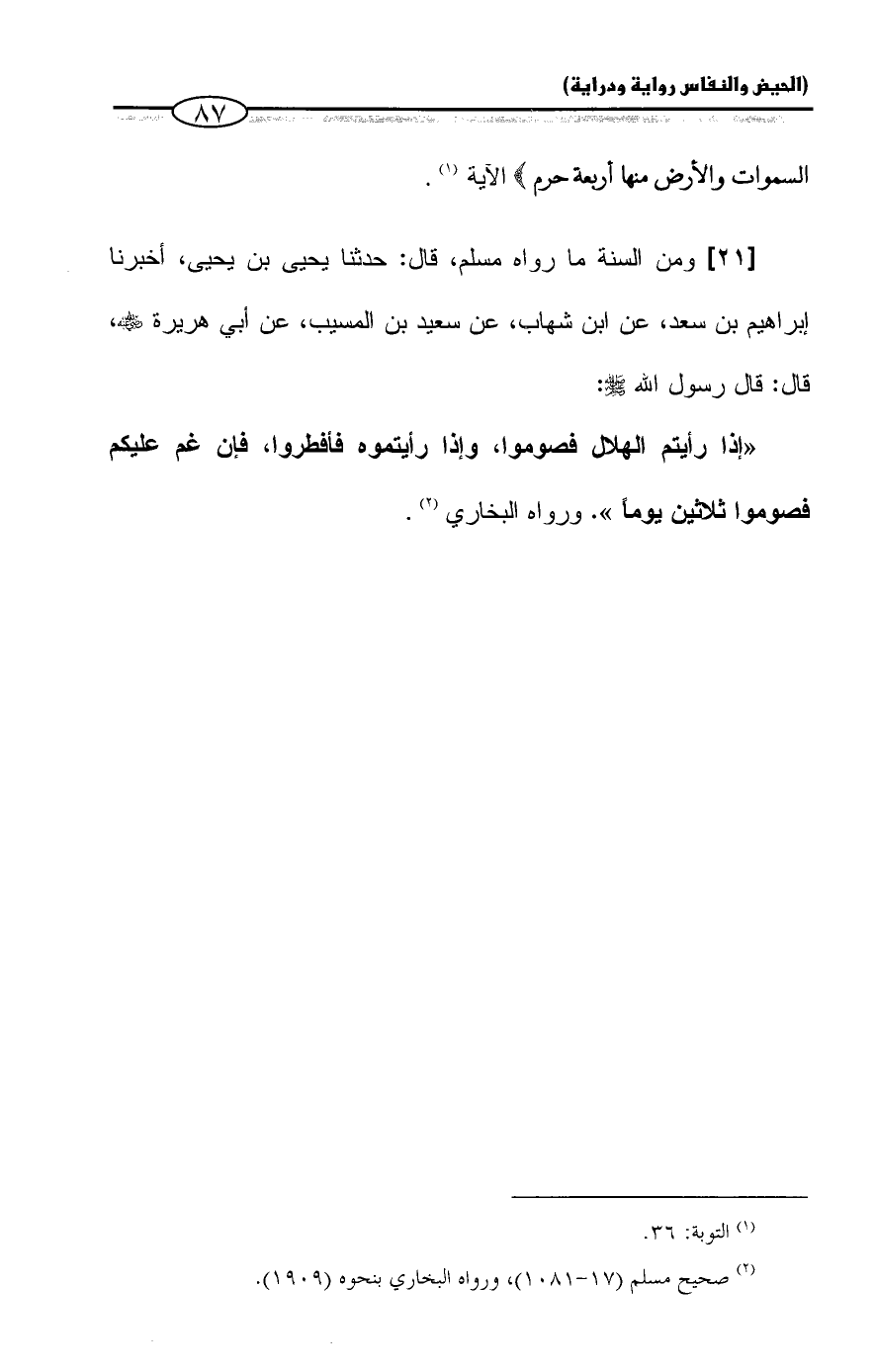 [٢١] ومن السنة ما رواه مسلم، قال: حدثنا يحيى بن يحيى، أخبرنا إبراهيم بن سعد، عن ابن شهاب، عن سعيد بن المسيب، عن أبي هريرة - رضي الله عنه -، قال: قال رسول الله - صلى الله عليه وسلم -:
