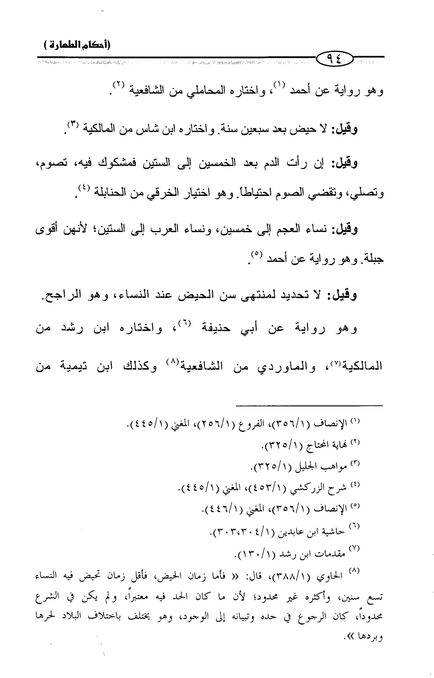 (¬٨) الحاوي (١/ ٣٨٨)، قال: "فأما زمان الحيض، فأقل زمان تحيض فيه النساء تسع سنين، وأكثره غير محدود؛ لأن ما كان الحد فيه معتبراً، ولم يكن في الشرع محدوداً، كان الرجوع في حده وتبيانه إلى الوجود، وهو يختلف باختلاف البلاد لحرها وبردها".