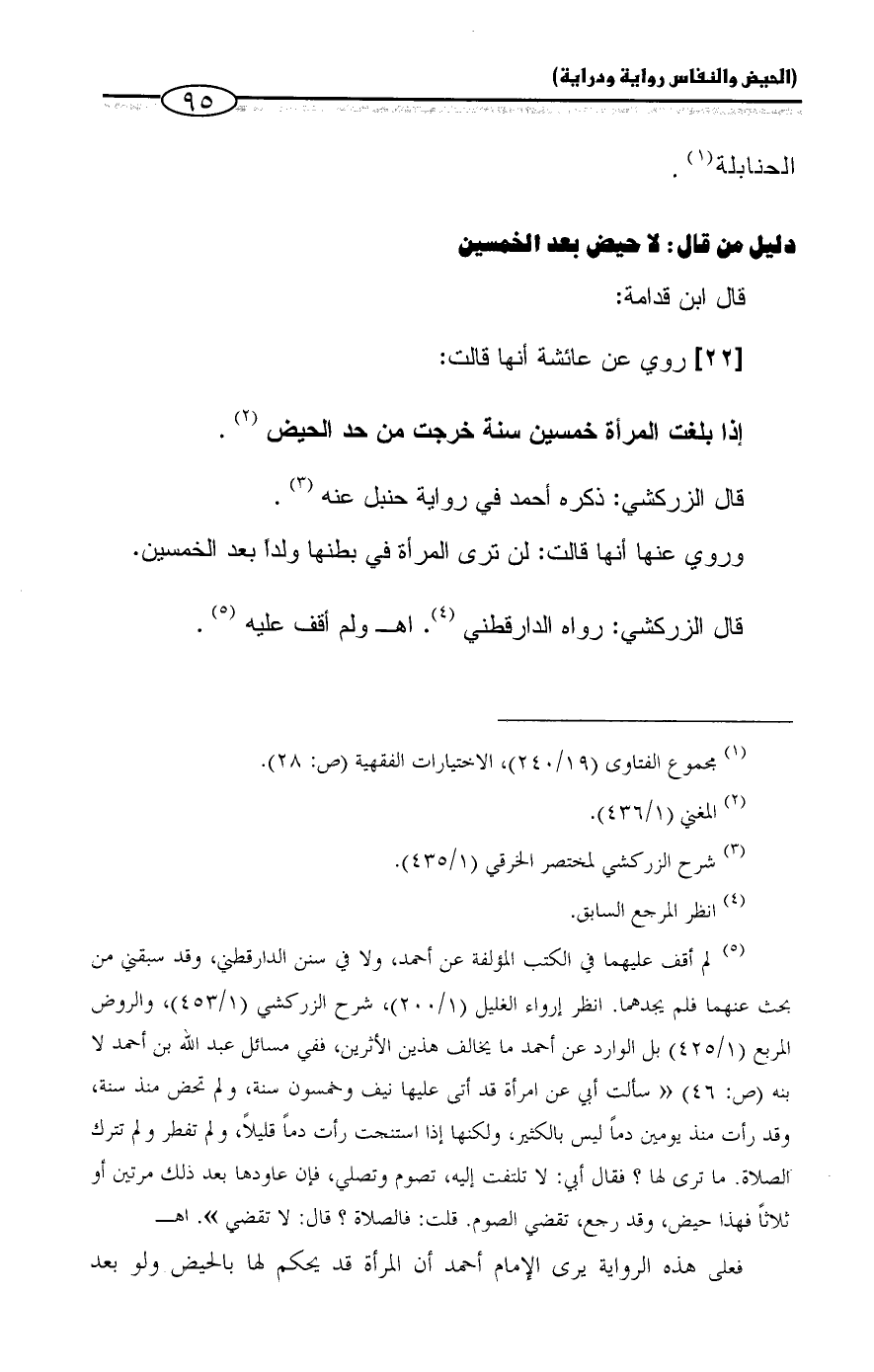 (¬٥) لم أقف عليهما في الكتب المؤلفة عن أحمد، ولا في سنن الدارقطني، وقد سبقني من بحث عنهما فلم يجدهما. انظر إرواء الغليل (١/ ٢٠٠)، شرح الزركشي (١/ ٤٥٣)، والروض المربع (١/ ٤٢٥) بل الوارد عن أحمد ما يخالف هذين الأثرين، ففي مسائل عبد الله بن أحمد لابنه (ص: ٤٦) "سألت أبي عن امرأة قد أتى عليها نيف وخمسون سنة، ولم تحض منذ سنة، وقد رأت منذ يومين دماً ليس بالكثير، ولكنها إذا استنجت رأت دماً قليلاً، ولم تفطر ولم تترك الصلاة. ما ترى لها؟ فقال أبي: لا تلتفت إليه، تصوم وتصلي، فإن عاودها بعد ذلك مرتين أو ثلاثاً فهذا حيض، وقد رجع، تقضي الصوم. قلت: فالصلاة؟ قال: لا تقضي". اهـ