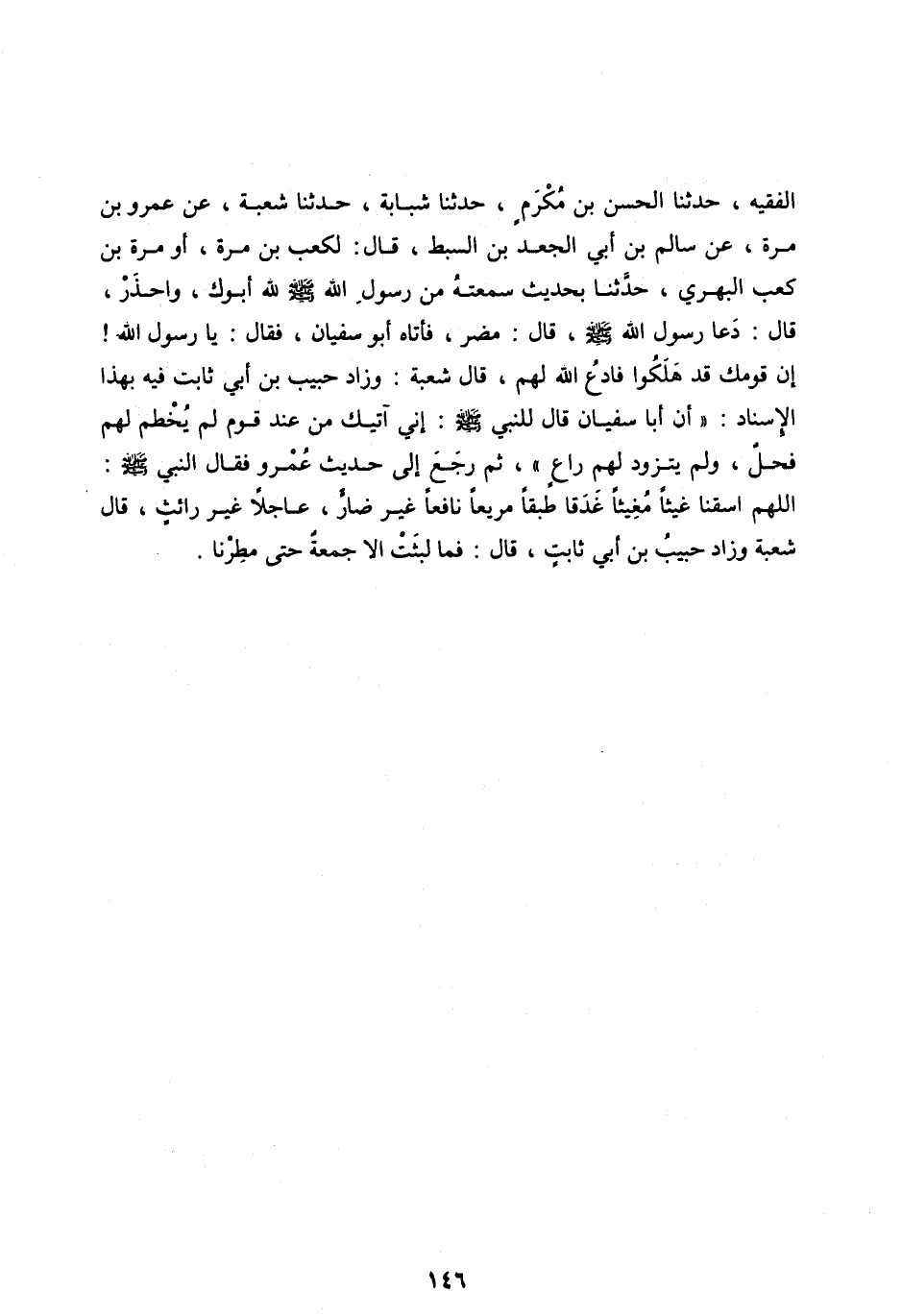 الْفَقِيهُ، حَدَّثَنَا الْحَسَنُ بْنُ مُكْرَمٍ، حَدَّثَنَا شَبَابَةُ، حَدَّثَنَا شُعْبَةُ، عَنْ عَمْرِو بْنِ مُرَّةَ، عَنْ سَالِمِ بْنِ أَبِي الْجَعْدِ بْنِ السَّبْطِ، قَالَ: لِكَعْبِ بْنِ مُرَّةَ، أَوْ مُرَّةَ بْنِ كَعْبٍ البهري، حَدِّثْنَا بِحَدِيثٍ سَمِعْتُهُ مِنْ رَسُولِ اللهِ صَلَّى اللهُ عَلَيْهِ وَسَلَّمَ لِلَّهِ أَبُوكَ، وَاحْذَرْ، قَالَ: دَعَا رَسُولُ اللهِ صَلَّى اللهُ عَلَيْهِ وَسَلَّمَ، قَالَ: مُضَرُ، فَأَتَاهُ أَبُو سُفْيَانَ، فَقَالَ: يَا رَسُولَ اللهِ! إِنَّ قَوْمَكَ قَدْ هَلَكُوا فَادْعُ اللهَ لَهُمْ، قَالَ شُعْبَةُ: وَزَادَ حَبِيبُ بْنُ أَبِي ثَابِتٍ فِيهِ بِهَذَا الْإِسْنَادِ: «أَنَّ أَبَا سُفْيَانَ قَالَ لِلنَّبِيِّ صَلَّى اللهُ عَلَيْهِ وسلم: إِنِّي آتِيكَ مِنْ عِنْدِ قَوْمٍ لَمْ يُخْطَمْ لَهُمْ فَحْلٌ، وَلَمْ يَتَزَوَّدُ لَهُمْ رَاعٍ» ، ثُمَّ رَجَعَ إِلَى حَدِيثِ عَمْرٍو فَقَالَ النَّبِيُّ صَلَّى اللهُ عليه وسلم: