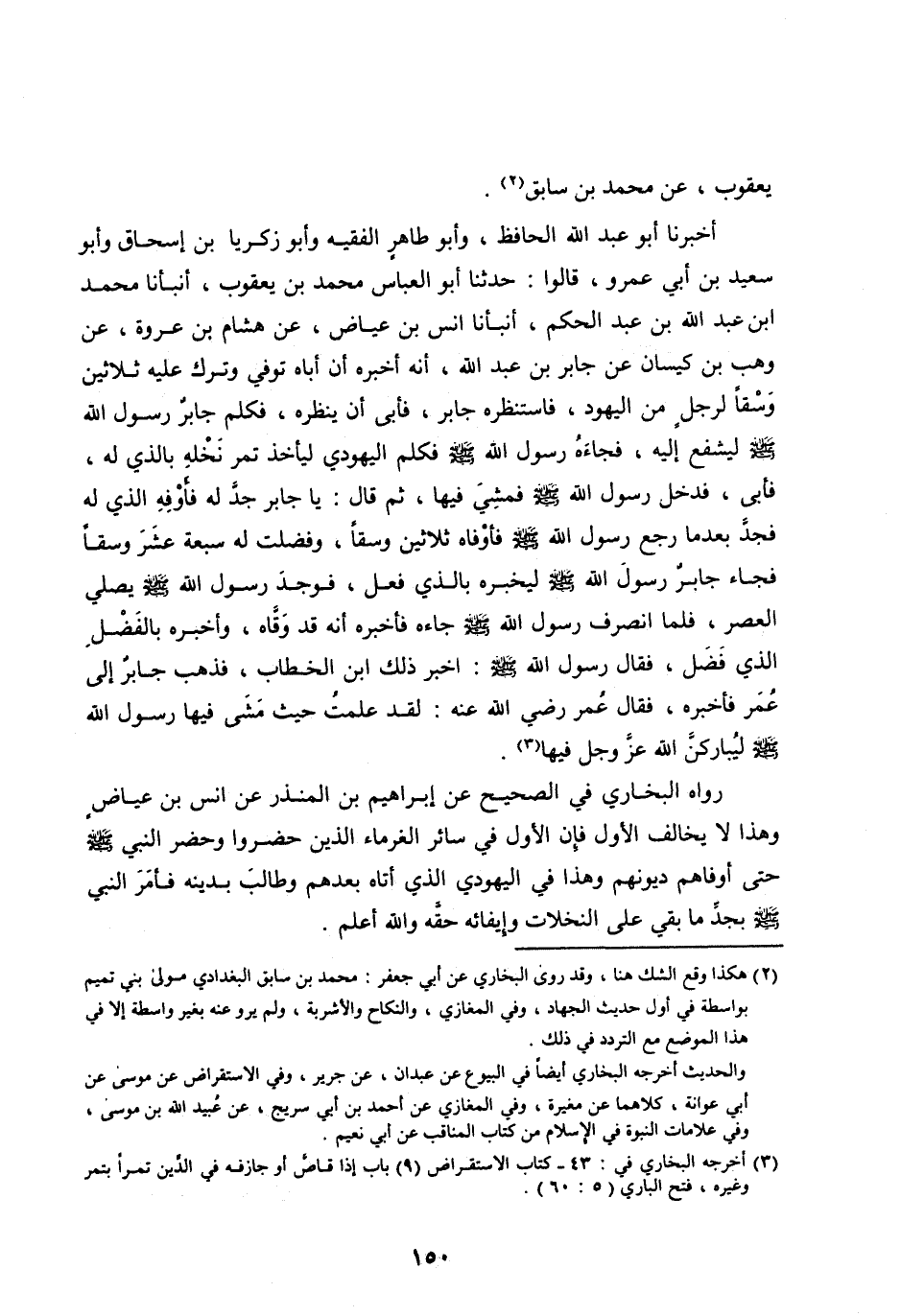 أَخْبَرَنَا أَبُو عَبْدِ اللهِ الْحَافِظُ، وَأَبُو طَاهِرٍ الْفَقِيهُ وَأَبُو زَكَرِيَّا بْنُ إِسْحَاقَ وَأَبُو سَعِيدِ بْنُ أَبِي عَمْرٍو، قَالُوا: حَدَّثَنَا أَبُو الْعَبَّاسِ مُحَمَّدُ بْنُ يَعْقُوبَ، أَنْبَأَنَا محمد ابْنَ عَبْدِ اللهِ بْنِ عَبْدِ الْحَكَمِ، أَنْبَأَنَا أَنَسُ بْنُ عِيَاضٍ، عَنْ هِشَامِ بْنِ عُرْوَةَ، عَنْ وَهْبِ بْنِ كَيْسَانَ عَنْ جَابِرِ بْنِ عَبْدِ الله، أنه أَخْبَرَهُ أَنَّ أَبَاهُ تُوُفِّيَ وَتَرَكَ عَلَيْهِ ثَلَاثِينَ وَسْقًا لِرَجُلٍ مِنَ الْيَهُودِ، فَاسْتَنْظَرَهُ جَابِرٌ، فَأَبَى أَنْ يُنْظِرَهُ، فَكَلَّمَ جَابِرٌ رَسُولَ اللهِ صلى الله عليه وسلم لَيَشْفَعَ إِلَيْهِ، فَجَاءَهُ رَسُولُ اللهِ صَلَّى اللهُ عليه وَسَلَّمَ فَكَلَّمَ الْيَهُودِيَّ لِيَأْخُذَ تَمْرَ نَخْلَهِ بِالَّذِي لَهُ، فَأَبَى، فَدَخَلَ رَسُولُ اللهِ صَلَّى اللهُ عَلَيْهِ وَسَلَّمَ فَمَشَى فِيهَا، ثُمَّ قَالَ: يَا جَابِرُ جِدَّ لَهُ فَأَوْفِهِ الَّذِي لَهُ فَجَدَّ بعد ما رَجَعَ رَسُولُ اللهِ صَلَّى اللهُ عَلَيْهِ وَسَلَّمَ فَأَوْفَاهُ ثَلَاثِينَ وَسْقًا، وَفَضَلَتْ لَهُ سَبْعَةَ عَشَرَ وَسْقًا فَجَاءَ جَابِرٌ رَسُولَ اللهِ صَلَّى اللهُ عَلَيْهِ وَسَلَّمَ لِيُخْبِرَهُ بِالَّذِي فَعَلَ، فَوَجَدَ رَسُولَ اللهِ صَلَّى الله عليه وَسَلَّمَ يُصَلِّي الْعَصْرَ، فَلَمَّا انْصَرَفَ رَسُولُ اللهِ صَلَّى اللهُ عَلَيْهِ وَسَلَّمَ جَاءَهُ فأخبره أنه قد وقّاه، وَأَخْبَرَهُ بِالْفَضْلِ الَّذِي فَضَلَ، فَقَالَ رَسُولُ اللهِ صَلَّى اللهُ عَلَيْهِ وَسَلَّمَ: أَخْبِرْ ذَلِكَ ابْنَ الْخَطَّابِ، فَذَهَبَ جَابِرٌ إِلَى عُمَرَ فَأَخْبَرَهُ، فَقَالَ عُمَرُ رَضِيَ اللهُ عَنْهُ: لَقَدْ عَلِمْتُ حَيْثُ مَشَى فِيهَا رَسُولُ اللهِ صلى الله عليه وسلم لَيُبَارِكَنَّ اللهُ عَزَّ وَجَلَّ فِيهَا [ (3) ] .