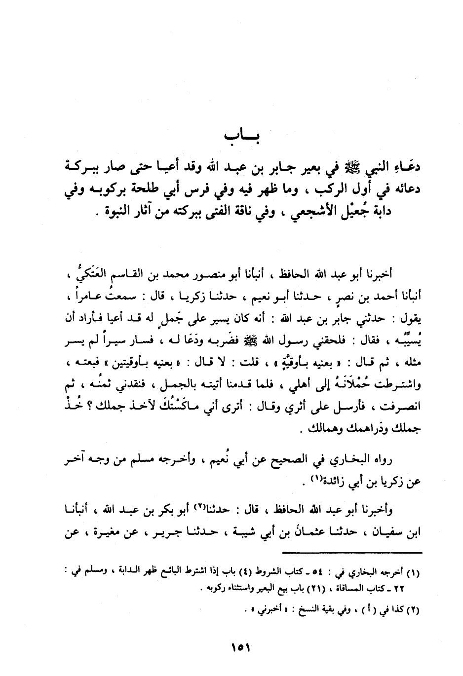 أَخْبَرَنَا أَبُو عَبْدِ اللهِ الْحَافِظُ، أَنْبَأَنَا أَبُو مَنْصُورٍ مُحَمَّدُ بْنُ الْقَاسِمِ الْعَتَكِيُّ، أَنْبَأَنَا أَحْمَدُ بْنُ نَصْرٍ، حَدَّثَنَا أَبُو نُعَيْمٍ، حَدَّثَنَا زَكَرِيَّا، قَالَ: سَمِعْتُ عَامِرًا، يَقُولُ: حَدَّثَنِي جَابِرُ بْنُ عَبْدِ اللهِ: أَنَّهُ كَانَ يَسِيرُ عَلَى جَمَلٍ لَهُ قَدْ أَعْيَا فَأَرَادَ أَنْ يُسَيِّبَهُ، فَقَالَ: فَلَحِقَنِي رسول الله صلى الله عَلَيْهِ وَسَلَّمَ فَضَرَبَهُ وَدَعَا لَهُ، فَسَارَ سَيْرًا لَمْ يَسِرْ مِثْلَهُ، ثُمَّ قَالَ: «بِعْنِيهِ بِأُوقِيَةٍ» ، قُلْتُ: لَا قَالَ: «بِعْنِيهِ بِأُوقِيَتَيْنِ» فَبِعْتُهُ، وَاشْتَرَطْتُ حُمْلَانَهُ إِلَى أَهْلِي، فَلَمَّا قَدِمْنَا أَتَيْتُهُ بِالْجَمَلِ، فَنَقَدَنِي ثَمَنَهُ، ثُمَّ انْصَرَفْتُ، فَأَرْسَلَ عَلَى أَثَرِي وَقَالَ: أَتَرَى أَنِّي مَاكَسْتُكَ لِآخُذَ جَمَلَكَ؟ خُذْ جَمَلَكَ وَدَرَاهِمَكَ وهمالك.