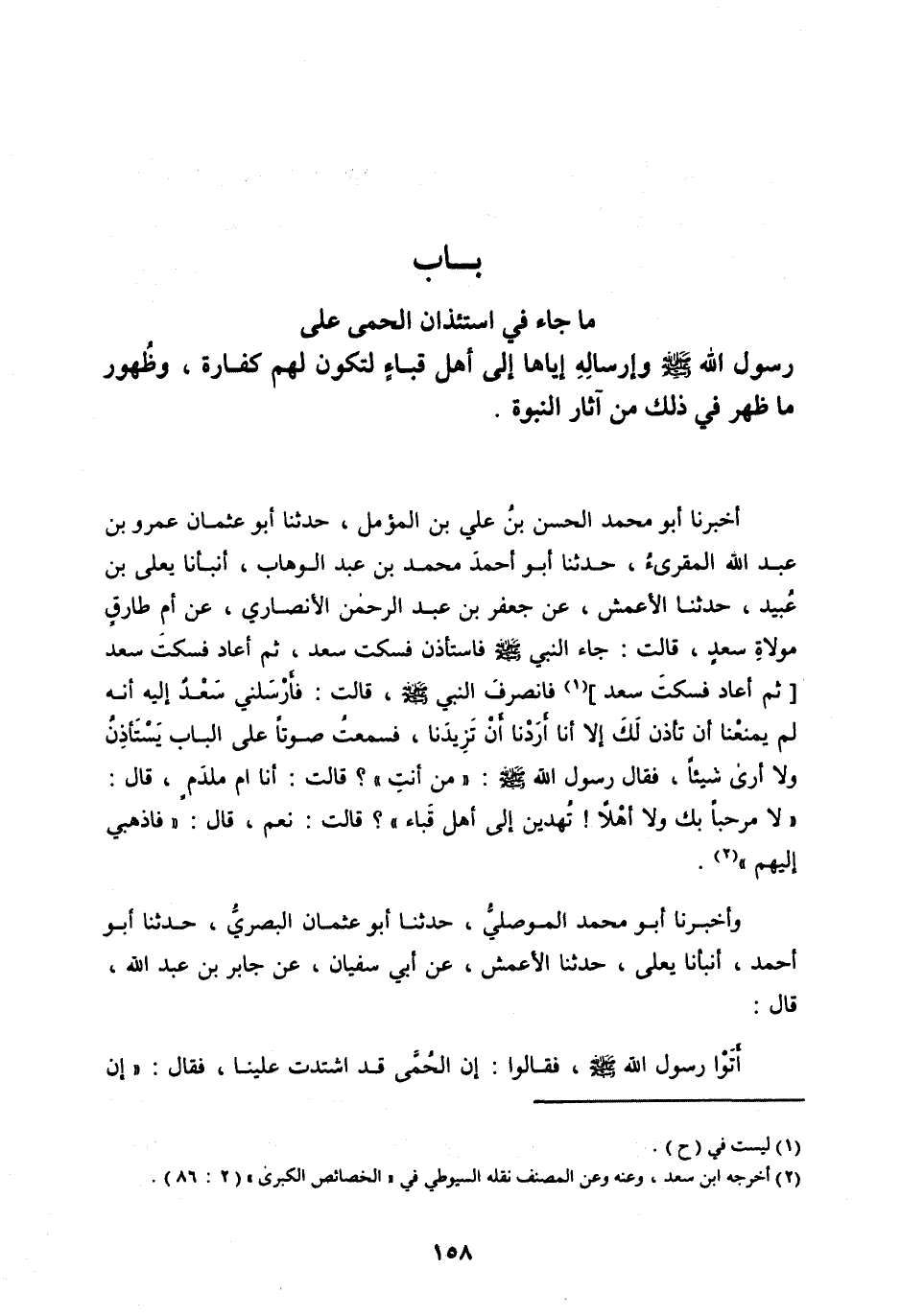 بَابُ مَا جَاءَ فِي اسْتِئْذَانِ الْحُمَّى عَلَى رَسُولِ الله صلى الله عليه وَسَلَّمَ وَإِرْسَالِهِ إِيَّاهَا إِلَى أَهْلِ قُبَاءَ لِتَكُونَ لَهُمْ كَفَّارَةً، وَظُهُورِ مَا ظَهَرَ فِي ذَلِكَ مِنْ آثَارِ النُّبُوَّةِ.