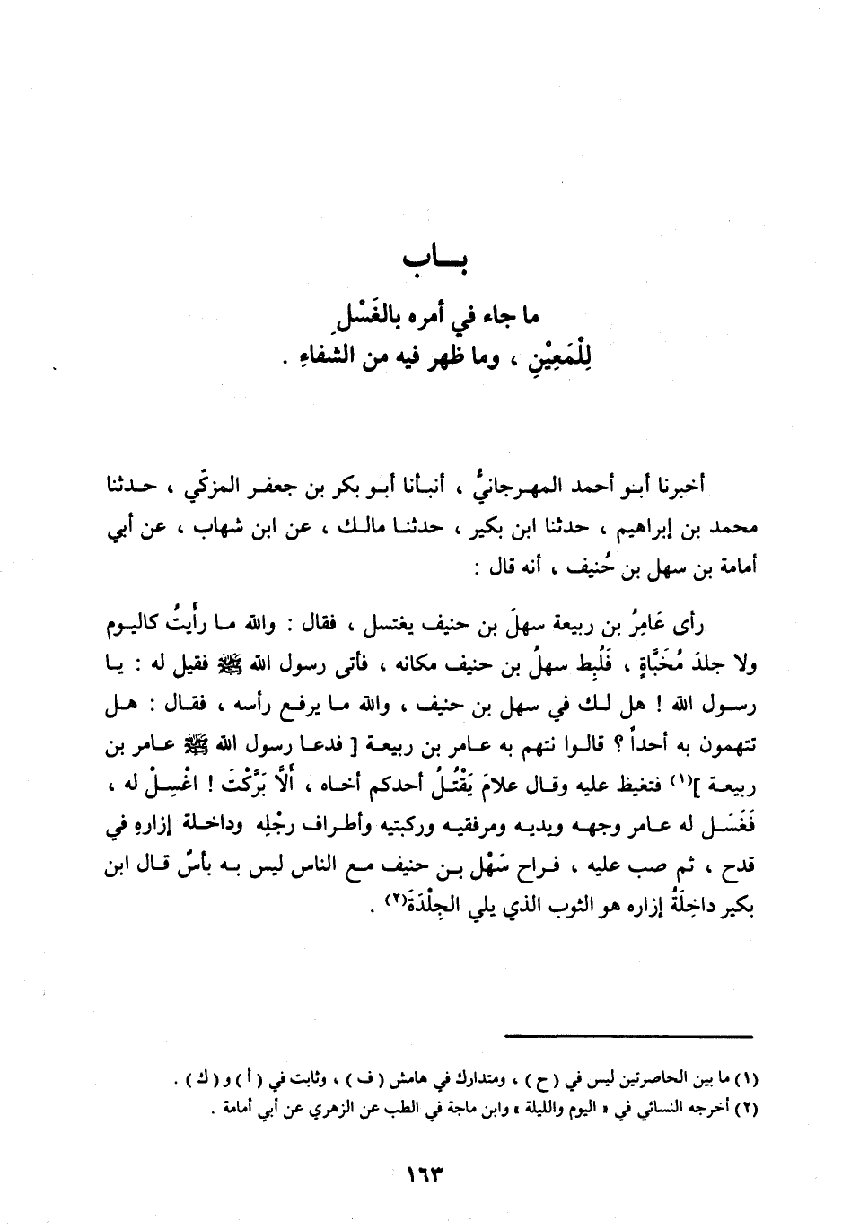 أَخْبَرَنَا أَبُو أَحْمَدَ الْمَهْرَجَانِيُّ، أَنْبَأَنَا أَبُو بَكْرِ بْنُ جَعْفَرٍ الْمُزَكِّي، حَدَّثَنَا مُحَمَّدِ بْنِ إِبْرَاهِيمَ، حَدَّثَنَا ابْنُ بُكَيْرٍ، حَدَّثَنَا مَالِكٌ، عَنِ ابْنِ شِهَابٍ، عَنْ أَبِي أُمَامَةَ بْنِ سَهْلِ بْنِ حُنَيْفٍ، أَنَّهُ قَالَ: رَأَى عَامِرُ بْنُ رَبِيعَةَ سَهْلَ بْنَ حُنَيْفٍ يَغْتَسِلُ، فَقَالَ: وَاللهِ مَا رَأَيْتُ كَالْيَوْمِ وَلَا جِلْدَ مُخَبَّأَةٍ، فَلُبِطَ سَهْلُ بْنُ حُنَيْفٍ مَكَانَهُ، فأتى رسول الله صلى اللهُ عَلَيْهِ وَسَلَّمَ فَقِيلَ لَهُ: يَا رَسُولَ اللهِ! هَلْ لَكَ فِي سَهْلِ بْنِ حُنَيْفٍ، وَاللهِ مَا يَرْفَعُ رَأْسَهُ، فَقَالَ: هَلْ تَتَّهِمُونَ بِهِ أَحَدًا؟ قَالُوا نَتَّهِمُ بِهِ عَامِرَ بْنَ رَبِيعَةَ [فَدَعَا رَسُولُ اللهِ صَلَّى الله عليه وسلم عَامِرُ بْنُ رَبِيعَةَ] [ (1) ] فَتَغَيَّظَ عَلَيْهِ وَقَالَ عَلَامَ يَقْتُلُ أَحَدُكُمْ أَخَاهُ، أَلَا بَرَّكْتَ! اغْسِلْ لَهُ، فَغَسَلَ لَهُ عَامِرٌ وَجْهَهُ وَيَدَيْهِ وَمِرْفَقَيْهِ وَرُكْبَتَيْهِ وَأَطْرَافَ رِجْلِهِ وَدَاخِلَةَ إِزَارِهِ فِي قَدَحٍ، ثُمَّ صَبَّ عَلَيْهِ، فَرَاحَ سَهْلُ بْنُ حُنَيْفٍ مَعَ النَّاسِ لَيْسَ بِهِ بَأْسٌ قَالَ ابْنُ بُكَيْرٍ دَاخِلَةُ إِزَارِهِ هُوَ الثَّوْبُ الَّذِي يَلِي الجلدة