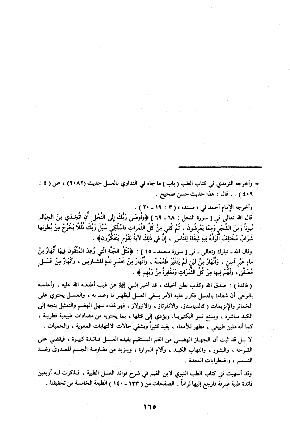وقد أسهبت في كتاب الطب النبوي لابن القيم في شرح فوائد العسل الطبية، فذكرت له أربعين فائدة طبية صرفة فارجع إليها لزاما. الصفحات من (133- 140) الطبعة الخامسة من تحقيقنا.