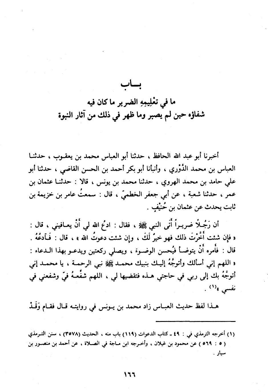 بَابُ مَا فِي تَعْلِيمِهِ الضَّرِيرَ مَا كَانَ فِيهِ شِفَاؤُهُ حِينَ لَمْ يَصْبِرْ ومَا ظَهَرَ فِي ذَلِكَ مِنْ آثَارِ النُّبُوَّةِ