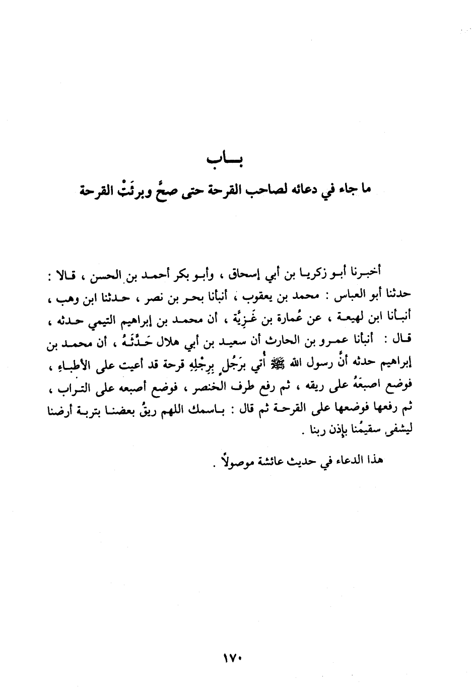 حَدَّثَنَا أَبُو الْعَبَّاسِ: مُحَمَّدُ بْنُ يَعْقُوبَ، أَنْبَأَنَا بَحْرُ بْنُ نَصْرٍ، حَدَّثَنَا ابْنُ وَهْبٍ، أَنْبَأَنَا ابْنُ لَهِيعَةَ، عَنْ عُمَارَةَ بْنِ غَزِيَّةَ، أَنَّ مُحَمَّدَ بْنَ إِبْرَاهِيمَ التَّيْمِيَّ حَدَّثَهُ، قَالَ: أَنْبَأَنَا عَمْرُو بْنُ الْحَارِثِ أَنَّ سَعِيدَ بْنَ أَبِي هِلَالٍ حَدَّثَهُ، أَنَّ مُحَمَّدَ بْنَ إِبْرَاهِيمَ حَدَّثَهُ أَنَّ رَسُولَ اللهِ صَلَّى اللهُ عَلَيْهِ وسلم أُتِيَ بِرَجُلٍ بِرِجْلِهِ قُرْحَةٌ قَدْ أَعْيَتْ عَلَى الْأَطِبَّاءِ، فَوَضَعَ إِصْبَعَهُ عَلَى رِيقِهِ، ثُمَّ رَفَعَ طَرَفَ الْخِنْصَرِ، فَوَضَعَ إِصْبَعَهُ عَلَى التُّرَابِ، ثُمَّ رَفَعَهَا فَوَضَعَهَا عَلَى الْقُرْحَةِ ثُمَّ قَالَ: بِاسْمِكَ اللهُمَّ رِيقُ بَعْضِنَا بِتُرْبَةِ أَرْضِنَا لِيُشْفَى سَقِيمُنَا بِإِذْنِ رَبِّنَا.