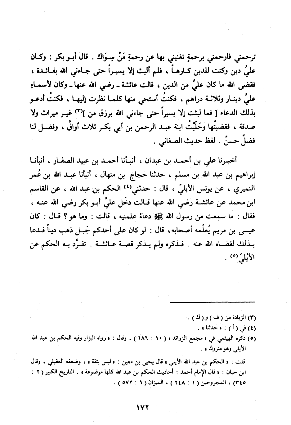 تَرْحَمُنِي فَارْحَمْنِي بِرَحْمَةٍ تُغْنِينِي بِهَا عَنْ رَحْمَةِ مَنْ سِوَاكَ. قَالَ أَبُو بَكْرٍ: وَكَانَ عَلَيَّ دَيْنٌ وَكُنْتُ لِلدَّيْنِ كَارِهًا، فَلَمْ أَلْبَثْ إِلَّا يَسِيرًا حَتَّى جَاءَنِي اللهُ بِفَائِدَةٍ، فَقَضَى اللهُ مَا كَانَ عَلَيَّ مِنَ الدَّيْنِ، قَالَتْ عَائِشَةُ- رَضِيَ اللهُ عَنْهَا- وَكَانَ لِأَسْمَاءَ عَلَيَّ دِينَارٌ وَثَلَاثَةُ دَرَاهِمَ، فَكُنْتُ أَسْتَحِي مِنْهَا كُلَّمَا نَظَرْتُ إِلَيْهَا، فَكُنْتُ أَدْعُو بِذَلِكَ الدُّعَاءِ [فَمَا لَبِثْتُ إِلَّا يَسِيرًا حَتَّى جَاءَنِي اللهُ بِرِزْقٍ مِنْ] [ (3) ] غَيْرِ مِيرَاثٍ وَلَا صَدَقَةٍ، فَقَضَيْتُهَا وَحَلَّيْتُ ابْنَةَ عَبْدِ الرَّحْمَنِ بْنِ أَبِي بَكْرٍ ثَلَاثَ أَوَاقٍ، وَفَضَلَ لَنَا فَضْلٌ حَسَنٌ. لَفْظُ حَدِيثِ الصَّغَانِيِّ.