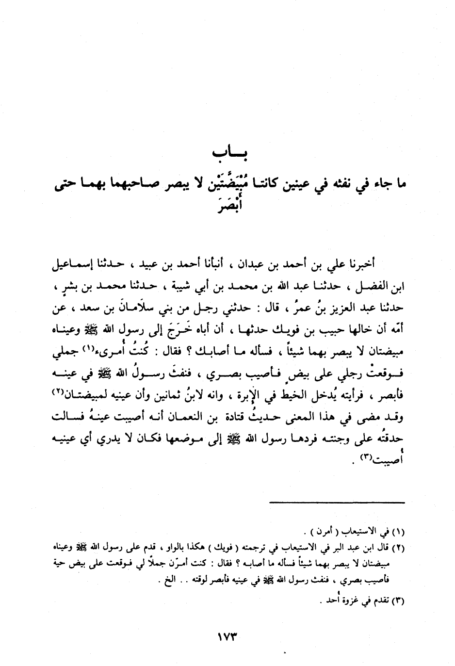 أَخْبَرَنَا عَلِيُّ بْنُ أَحْمَدَ بْنِ عَبْدَانَ، أَنْبَأَنَا أَحْمَدُ بْنُ عُبَيْدٍ، حَدَّثَنَا إِسْمَاعِيلُ ابن الْفَضْلِ، حَدَّثَنَا عَبْدُ اللهِ بْنُ مُحَمَّدِ بْنِ أَبِي شَيْبَةَ، حَدَّثَنَا مُحَمَّدُ بْنُ بِشْرٍ، حَدَّثَنَا عَبْدُ الْعَزِيزِ بْنُ عُمَرَ، قَالَ: حَدَّثَنِي رَجُلٌ مِنْ بَنِي سَلَامَانَ بْنِ سَعْدٍ، عَنْ أُمِّهِ أَنَّ خَالَهَا حَبِيبَ بْنَ فُوَيْكٍ حَدَّثَهَا، أَنَّ أَبَاهُ خَرَجَ إِلَى رَسُولِ اللهِ صَلَّى اللهُ عَلَيْهِ وسلم وَعَيْنَاهُ مُبْيَضَّتَانِ لَا يُبْصِرُ بِهِمَا شَيْئًا، فَسَأَلَهُ مَا أَصَابَكَ؟ فَقَالَ: كُنْتُ أُمْرِئُ [ (1) ] جَمَلِي فَوَقَعَتْ رِجْلَيَّ عَلَى بِيضٍ فَأُصِيبَ بَصَرِي، فَنَفَثَ رَسُولُ اللهِ صلى الله عَلَيْهِ وَسَلَّمَ فِي عَيْنِهِ فَأَبْصَرَ، فَرَأَيْتُهُ يُدْخِلُ الْخَيْطَ فِي الْإِبْرَةِ، وَإِنَّهُ لِابْنِ ثَمَانِينَ وَإِنَّ عَيْنَيْهِ لَمُبْيَضَّتَانِ [ (2) ] وَقَدْ مَضَى فِي هَذَا الْمَعْنَى حَدِيثُ قَتَادَةَ بْنِ النُّعْمَانِ أَنَّهُ أُصِيبَتْ عَيْنُهُ فَسَالَتْ حَدَقَتُهُ عَلَى وَجْنَتِهِ فَرَدَّهَا رَسُولُ اللهِ صَلَّى اللهُ عَلَيْهِ وَسَلَّمَ إِلَى مَوْضِعِهَا فَكَانَ لَا يَدْرِي أَيَّ عَيْنَيْهِ أصيبت