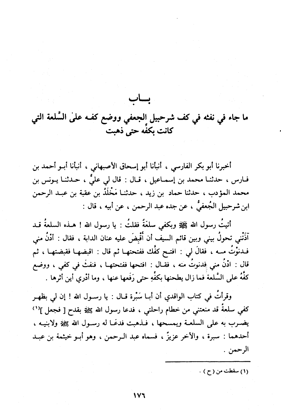 أَخْبَرَنَا أَبُو بَكْرٍ الْفَارِسِيُّ، أَنْبَأَنَا أَبُو إِسْحَاقَ الْأَصْبَهَانِيُّ، أَنْبَأَنَا أَبُو أَحْمَدَ بْنُ فَارِسٍ، حَدَّثَنَا مُحَمَّدُ بْنُ إِسْمَاعِيلَ، قَالَ: قَالَ لِي عَلِيٌّ، حَدَّثَنَا يُونُسُ بْنُ مُحَمَّدٍ الْمُؤَدِّبُ، حَدَّثَنَا حَمَّادُ بْنُ زَيْدٍ، حَدَّثَنَا مَخْلَدُ بْنُ عُقْبَةَ بن عبد الرحمن ابن شُرَحْبِيلَ الْجُعْفِيُّ، عَنْ جَدِّهِ عَبْدِ الرَّحْمَنِ، عَنْ أَبِيهِ، قَالَ: أَتَيْتُ رَسُولَ اللهِ صَلَّى اللهُ عليه وسلم وَبِكَفِّي سَلْعَةٌ فَقُلْتُ: يَا رَسُولَ اللهِ! هَذِهِ السَّلْعَةُ قَدْ آذَتْنِي تَحُولُ بَيْنِي وَبَيْنَ قَائِمِ السَّيْفِ أَنْ أَقْبِضَ عَلَيْهِ عَنَانَ الدَّابَّةِ، فَقَالَ: ادْنُ مِنِّي فَدَنَوْتُ مِنْهُ، فَقَالَ لِي: افْتَحْ كَفَّكَ فَفَتَحْتُهَا ثُمَّ قَالَ: اقْبِضْهَا فَقَبَضْتُهَا، ثُمَّ قَالَ: ادْنُ مِنِّي فَدَنَوْتُ مِنْهُ، فَقَالَ: افْتَحْهَا فَفَتَحْتُهَا، فَنَفَثَ فِي كَفِّي، وَوَضَعَ كَفَّهُ عَلَى السَّلْعَةِ فَمَا زَالَ يَطْحَنُهَا بِكَفِّهِ حَتَّى رَفَعَهَا عَنْهَا، وَمَا أَدْرِي أَيْنَ أَثَرُهَا.