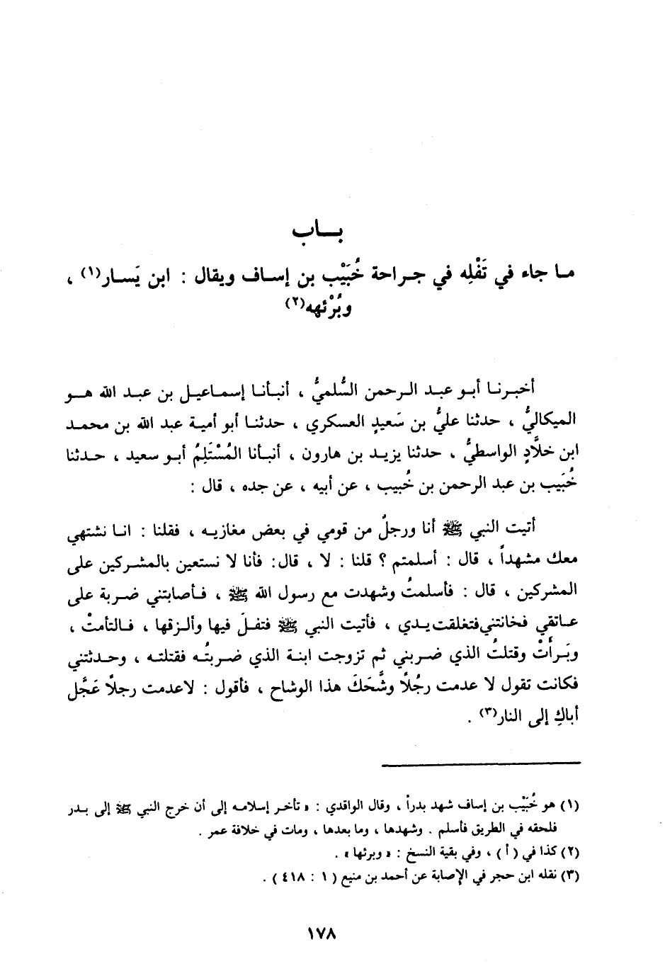 بَابُ مَا جَاءَ فِي تَفْلِهِ فِي جِرَاحَةِ خُبَيْبِ بْنِ إِسَافٍ وَيُقَالُ: ابْنُ يسار [ (1) ] ، وبرئهه [ (2) ]