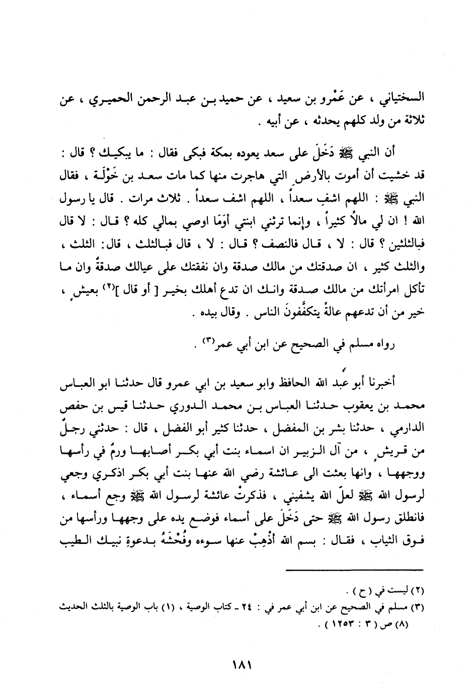 [ (3) ] مُسْلِمٌ فِي الصَّحِيحِ عَنِ ابْنِ أَبِي عُمَرَ في: 24- كتاب الوصية، (1) باب الوصية بالثلث الحديث (8) ص (3: 1253) .