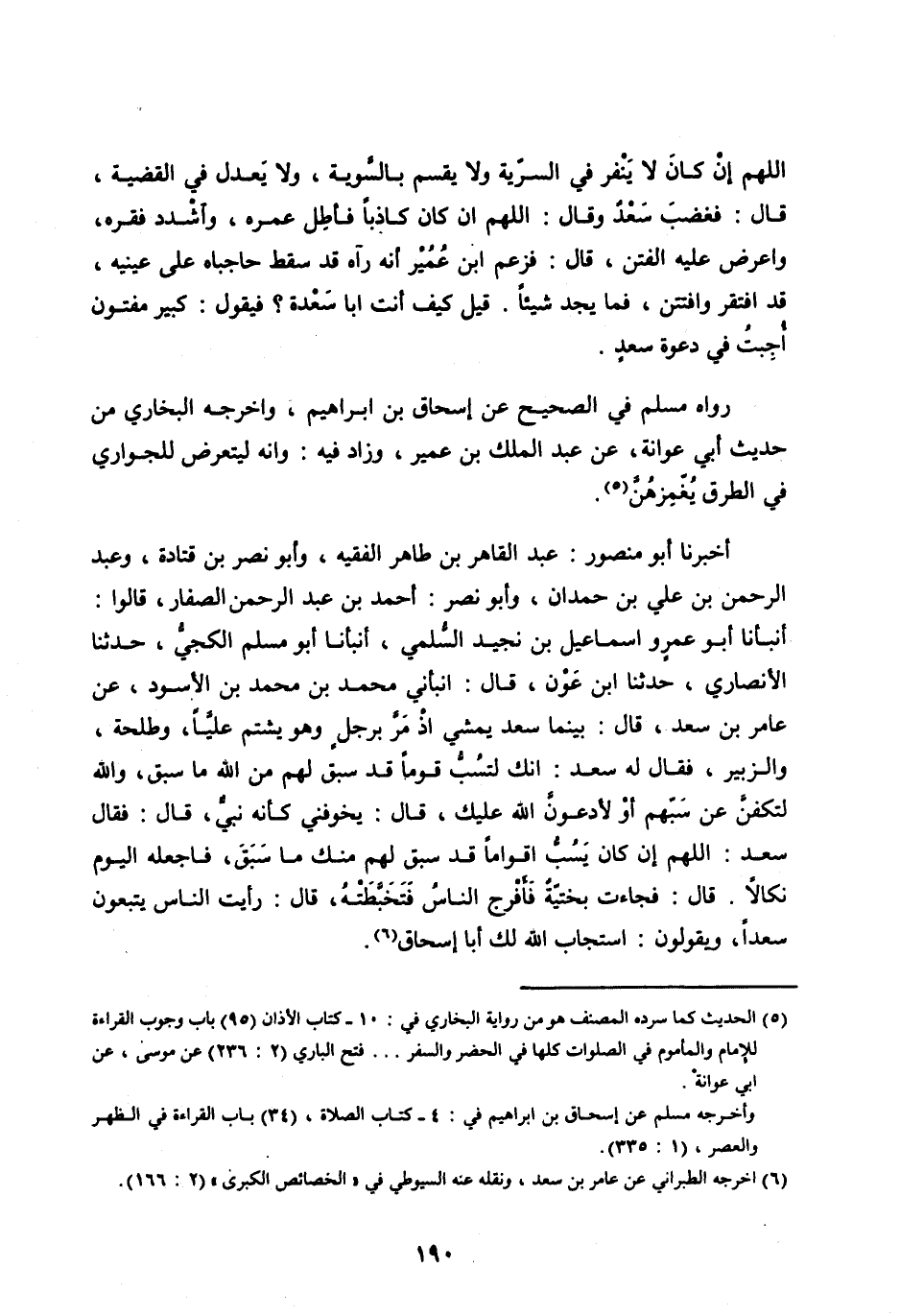 اللهُمَّ إِنْ كَانَ لَا يَنْفِرُ فِي السَّرِيَّةِ وَلَا يُقْسِمُ بِالسَّوِيَّةِ، وَلَا يَعْدِلُ فِي الْقَضِيَّةِ، قَالَ: فَغَضِبَ سَعْدٌ وَقَالَ: اللهُمَّ إِنْ كَانَ كَاذِبًا فَأَطِلْ عُمُرَهُ، وَأَشْدُدْ فَقْرَهُ، وَاعْرِضْ عَلَيْهِ الْفِتَنَ، قَالَ: فَزَعَمَ ابْنُ عُمَيْرٍ أَنَّهُ رَآهُ قَدْ سَقَطَ حَاجِبَاهُ عَلَى عَيْنَيْهِ، قَدِ افْتَقَرَ وَافْتُتِنَ، فَمَا يَجِدُ شَيْئًا. قِيلَ كَيْفَ أَنْتَ أَبَا سَعْدَةَ؟ فَيَقُولُ: كبير مفتون أجبت فِيَّ دَعْوَةُ سَعْدٍ.
