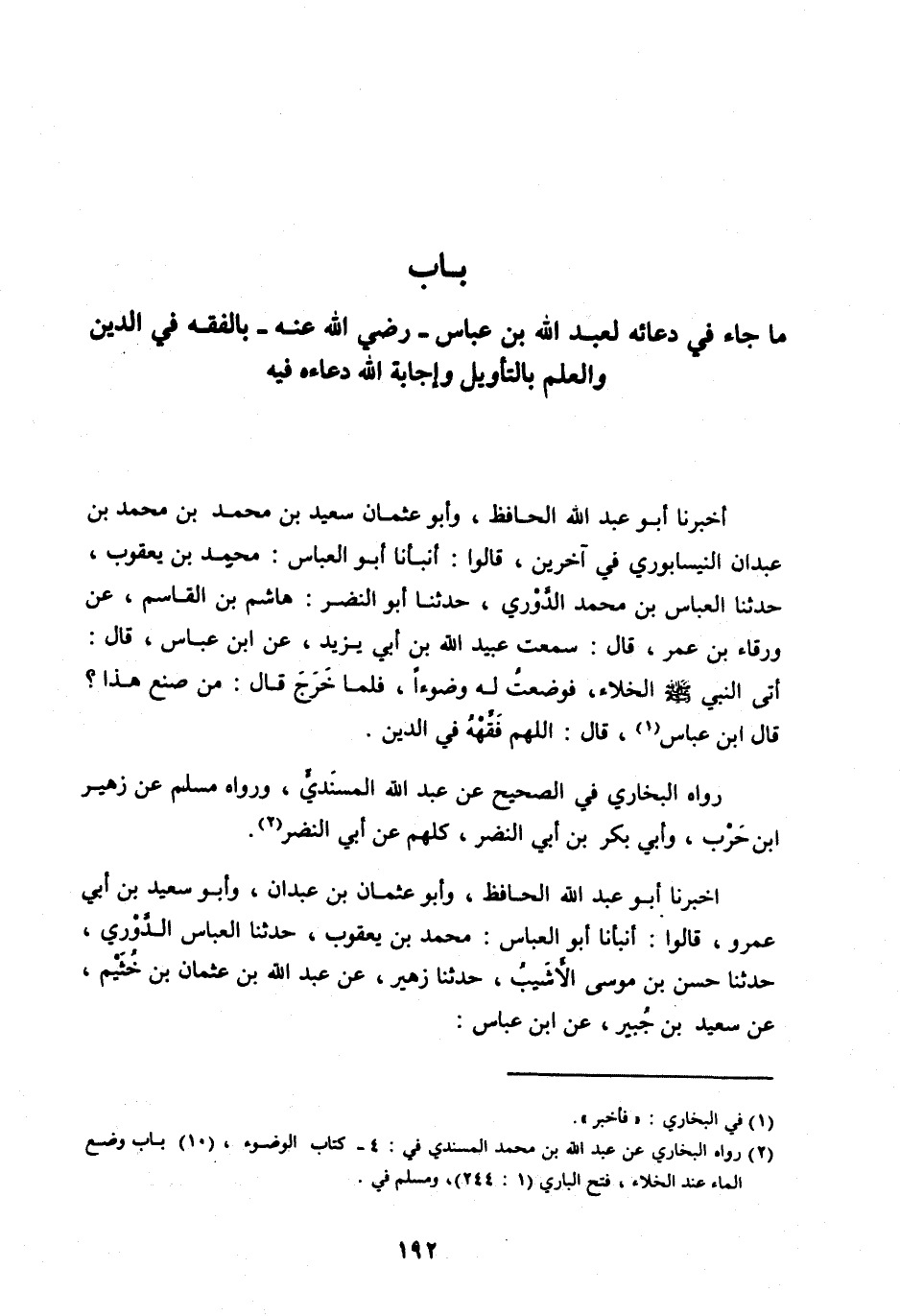 أَخْبَرَنَا أَبُو عَبْدِ اللهِ الْحَافِظُ، وأَبُو عُثْمَانَ سَعِيدُ بْنُ مُحَمَّدِ بْنِ مُحَمَّدِ بْنِ عَبْدَانَ النَّيْسَابُورِيُّ فِي آخَرِينَ، قَالُوا: أَنْبَأَنَا أَبُو الْعَبَّاسِ: مُحَمَّدُ بْنُ يَعْقُوبَ، حَدَّثَنَا الْعَبَّاسُ بْنُ مُحَمَّدٍ الدُّورِيُّ، حَدَّثَنَا أَبُو النَّضْرِ: هَاشِمُ بْنُ الْقَاسِمِ، عَنْ وَرْقَاءَ بْنِ عُمَرَ، قَالَ: سَمِعْتُ عُبَيْدَ اللهِ بن أبي يزيد، عَنِ ابْنِ عَبَّاسٍ، قَالَ: أَتَى النَّبِيَّ صَلَّى اللهُ عَلَيْهِ وَسَلَّمَ الْخَلَاءَ، فَوَضَعْتُ لَهُ وَضُوءًا، فَلَمَّا خَرَجَ قَالَ: مَنْ صَنَعَ هَذَا؟