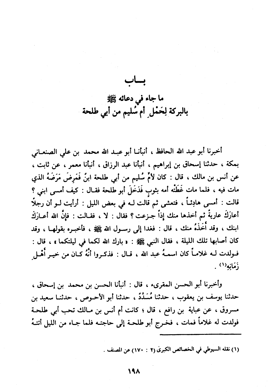 وَأَخْبَرَنَا أَبُو الْحَسَنِ الْمُقْرِئُ، قَالَ: أَنْبَأَنَا الْحَسَنُ بْنُ مُحَمَّدِ بْنِ إِسْحَاقَ، حَدَّثَنَا يُوسُفُ بْنُ يَعْقُوبَ، حَدَّثَنَا مُسَدَّدٌ، حَدَّثَنَا أَبُو الْأَحْوَصِ، حَدَّثَنَا سَعِيدُ بْنُ مَسْرُوقٍ، عَنْ عَبَايَةَ بْنِ رَافِعٍ، قَالَ، كَانَتْ أُمُّ أَنَسِ بْنِ مَالِكٍ تحب أَبِي طَلْحَةَ فَوَلَدَتْ لَهُ غُلَامًا فَمَاتَ، فَخَرَجَ أَبُو طَلْحَةَ إِلَى حَاجَتِهِ فَلَمَّا جَاءَ مِنَ اللَّيْلِ أَتَتْهُ