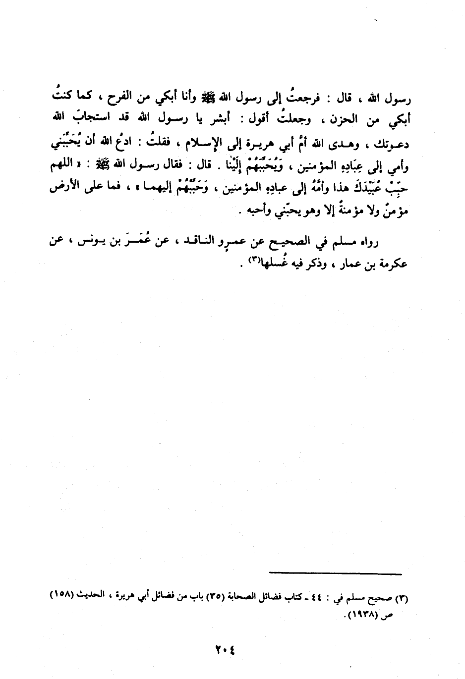 رَسُولُ اللهِ، قَالَ: فَرَجَعَتْ إِلَى رَسُولِ اللهِ صَلَّى اللهُ عَلَيْهِ وَسَلَّمَ وَأَنَا أَبْكِي مِنَ الْفَرَحِ، كَمَا كُنْتُ أَبْكِي مِنَ الْحُزْنِ، وَجَعَلْتُ أَقُولُ: أَبْشِرْ يَا رَسُولَ اللهِ قَدِ اسْتَجَابَ اللهُ دَعْوَتَكَ، وَهَدَى اللهُ أُمَّ أَبِي هُرَيْرَةَ إِلَى الْإِسْلَامِ، فَقُلْتُ: ادْعُ اللهَ أَنْ يُحَبِّبَنِي وَأُمِّي إِلَى عِبَادِهِ الْمُؤْمِنِينَ، وَيحَبِّبَهُمْ إِلَيْنَا. قَالَ: فَقَالَ رَسُولُ اللهِ صَلَّى اللهُ عَلَيْهِ وسلم: «اللهُمَّ حَبِّبْ عُبَيْدَكَ هَذَا وَأُمَّهُ إِلَى عِبَادِهِ الْمُؤْمِنِينَ، وَحَبِّبْهُمْ إِلَيْهِمَا» ، فَمَا عَلَى الْأَرْضِ مُؤْمِنٌ وَلَا مُؤْمِنَةٌ إِلَّا وَهُوَ يُحِبُّنِي وَأُحِبُهُ.
