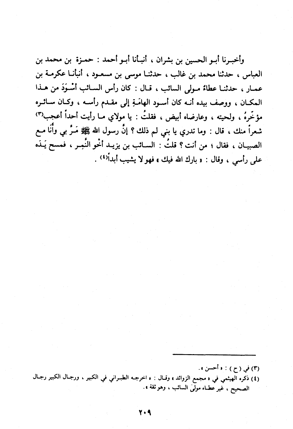 وأَخْبَرَنَا أَبُو الْحُسَيْنِ بْنُ بِشْرَانَ، أَنْبَأَنَا أَبُو أَحْمَدَ: حَمْزَةُ بْنُ مُحَمَّدِ بْنِ الْعَبَّاسِ، حَدَّثَنَا مُحَمَّدُ بْنُ غَالِبٍ، حَدَّثَنَا مُوسَى بْنُ مَسْعُودٍ، أَنْبَأَنَا عِكْرِمَةُ بْنُ عَمَّارٍ، حَدَّثَنَا عَطَاءٌ مَوْلَى السَّائِبِ، قَالَ: كَانَ رَأْسُ السَّائِبِ أَسْوَدَ مِنْ هَذَا الْمَكَانِ، وَوَصَفَ بِيَدِهِ أَنَّهُ كَانَ أَسْوَدَ الْهَامَةِ إِلَى مُقَدَّمِ رَأْسِهِ، وَكَانَ سَائِرُهُ مُؤَخَّرَهُ، وَلِحْيَتُهُ، وَعَارِضَاهُ أَبْيَضَ، فَقُلْتُ: يَا مَوْلَايَ مَا رَأَيْتُ أَحَدًا أَعْجَبَ [ (3) ] شَعْرًا مِنْكَ، قَالَ: وَمَا تَدْرِي يَا بُنَيَّ لِمَ ذَلِكَ؟ إِنَّ رَسُولَ الله صلى اللهُ عَلَيْهِ وَسَلَّمَ مَرَّ بِي وَأَنَا مَعَ الصِّبْيَانِ، فَقَالَ، مَنْ أَنْتَ؟ قُلْتُ: السَّائِبُ بْنُ يَزِيدَ أَخُو النَّمِرِ، فَمَسَحَ يَدَهُ عَلَى رَأْسِي، وَقَالَ: «بَارَكَ اللهُ فِيكَ» فَهُوَ لَا يَشِيبُ أَبَدًا