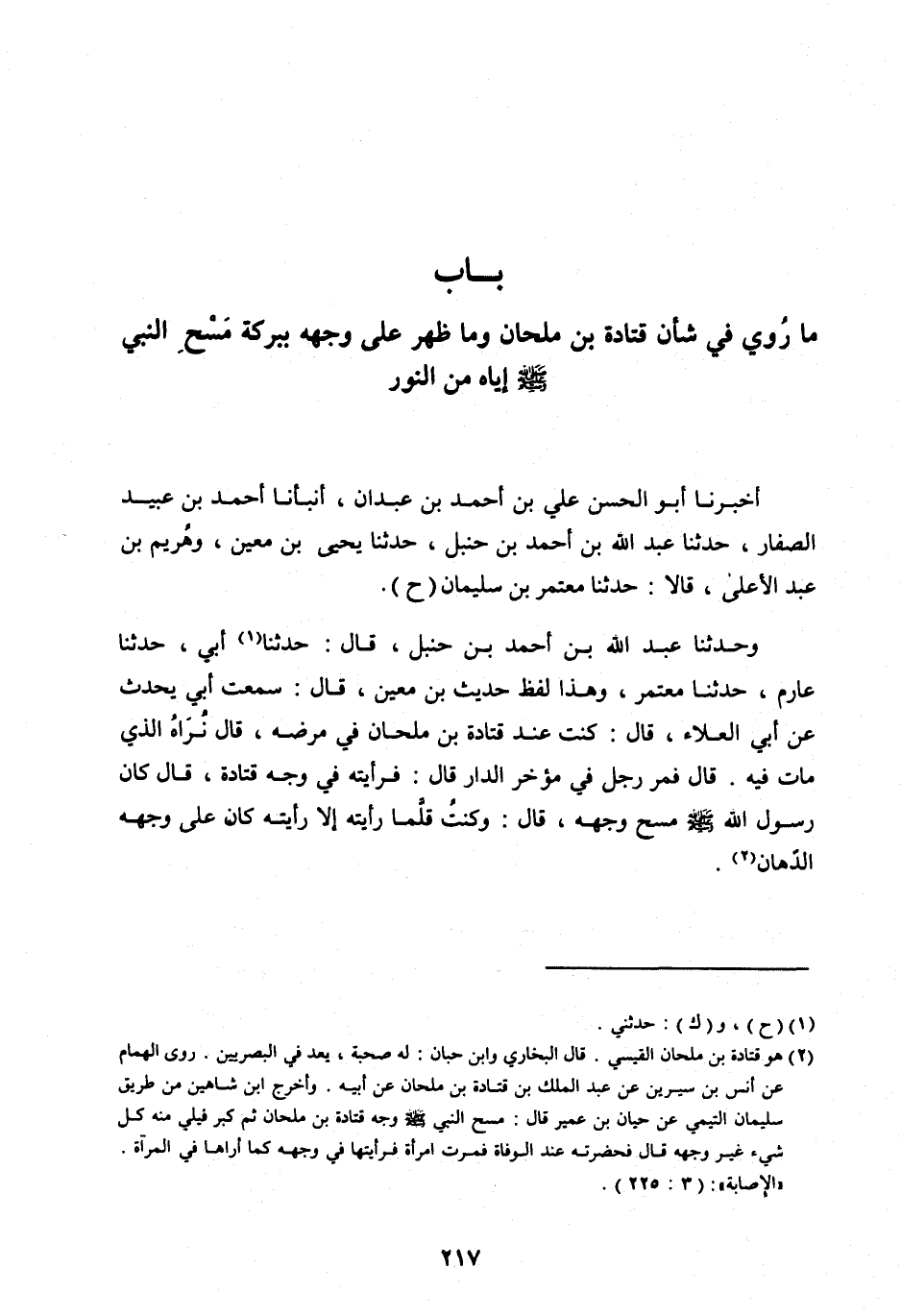 وحَدَّثَنَا عَبْدُ اللهِ بْنُ أَحْمَدَ بْنِ حَنْبَلٍ، قَالَ: حَدَّثَنَا [ (1) ] أَبِي، حَدَّثَنَا عَارِمٌ، حَدَّثَنَا مُعْتَمِرٌ، وَهَذَا لَفْظُ حديث بن مَعِينٍ، قَالَ: سَمِعْتُ أَبِي يُحَدِّثُ عَنْ أَبِي الْعَلَاءِ، قَالَ: كُنْتُ عِنْدَ قَتَادَةَ بْنِ مِلْحَانَ فِي مَرَضِهِ، قَالَ نَرَاهُ الَّذِي مَاتَ فِيهِ. قَالَ فَمَرَّ رَجُلٌ فِي مُؤَخَّرِ الدَّارِ قَالَ: فَرَأَيْتُهُ فِي وَجْهِ قَتَادَةَ، قَالَ كَانَ رَسُولُ اللهِ صَلَّى اللهُ عَلَيْهِ وسلم مَسَحَ وَجْهَهُ، قَالَ: وَكُنْتُ قَلَّمَا رَأَيْتُهُ إِلَّا رَأَيْتُهُ كَانَ عَلَى وَجْهِهِ الدِّهَانُ [ (2) ] .
