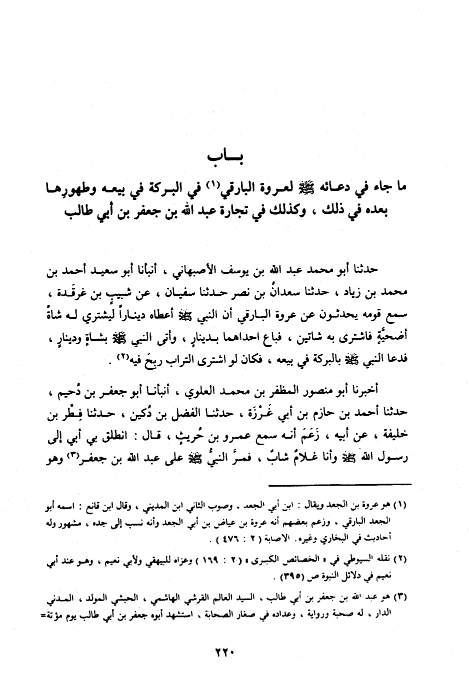 بَابُ مَا جَاءَ فِي دُعَائِهِ صَلَّى اللهُ عَلَيْهِ وَسَلَّمَ لِعُرْوَةَ الْبَارِقِيِّ [ (1) ] فِي البركة في بيعه وطهورها بَعْدَهُ فِي ذَلِكَ، وَكَذَلِكَ فِي تِجَارَةِ عَبْدَ اللهِ بْنَ جَعْفَرِ بْنِ أَبَى طَالِبٍ