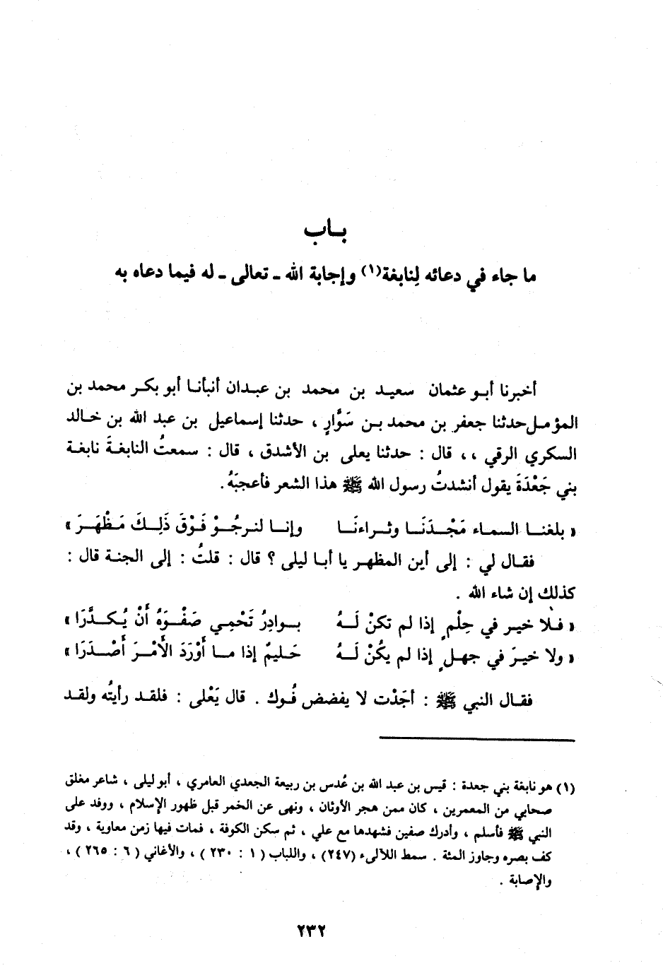 أَخْبَرَنَا أَبُو عُثْمَانَ سَعِيدُ بْنُ مُحَمَّدِ بْنِ عَبْدَانَ أَنْبَأَنَا أَبُو بَكْرٍ مُحَمَّدُ بْنُ الْمُؤَمَّلِ حَدَّثَنَا جَعْفَرُ بْنُ مُحَمَّدِ بْنِ سَوَّارٍ، حَدَّثَنَا إِسْمَاعِيلُ بْنُ عَبْدِ اللهِ بْنِ خَالِدٍ السُّكَّرِيُّ الرَّقِّيُّ، قَالَ: حَدَّثَنَا يَعْلَى بْنُ الْأَشْدَقِ، قَالَ: سَمِعْتُ النَّابِغَةَ نَابِغَةَ بَنِي جَعْدَةَ يَقُولُ أَنْشَدْتُ رَسُولَ الله صلى الله عليه وَسَلَّمَ هَذَا الشَّعْرَ فَأَعْجَبَهُ.