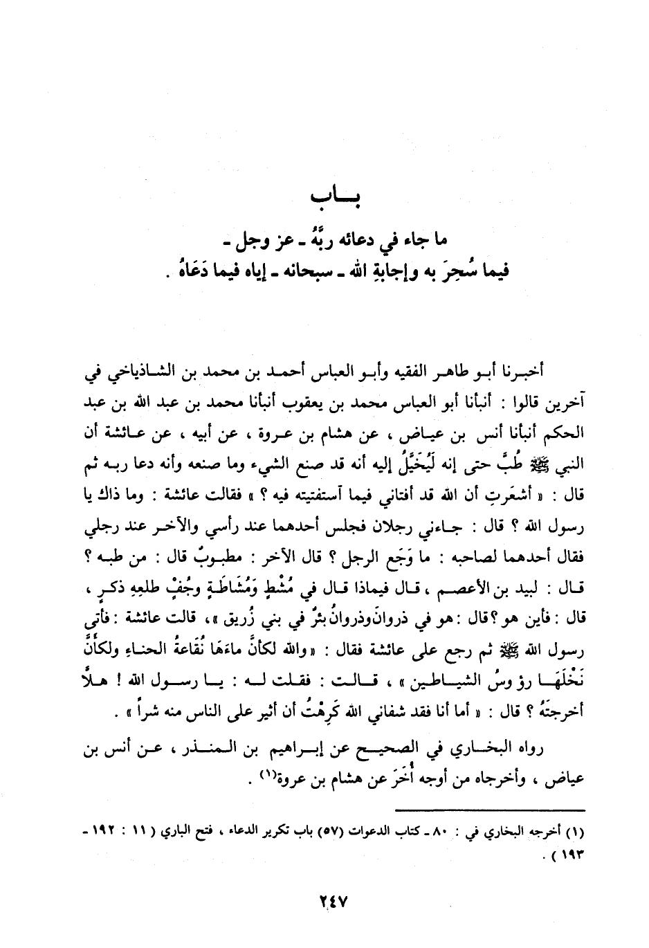 أَخْبَرَنَا أَبُو طَاهِرٍ الْفَقِيهُ وَأَبُو الْعَبَّاسِ أَحْمَدُ بْنُ مُحَمَّدِ بن الشاذياخي فِي آخَرِينَ قَالُوا: أَنْبَأَنَا أَبُو الْعَبَّاسِ مُحَمَّدُ بْنُ يَعْقُوبَ أَنْبَأَنَا مُحَمَّدُ بْنُ عَبْدِ اللهِ بْنِ عَبْدِ الْحَكَمِ أَنْبَأَنَا أَنَسُ بْنُ عِيَاضٍ، عَنْ هِشَامِ بْنِ عُرْوَةَ، عَنْ أَبِيهِ، عَنْ عَائِشَةَ أَنَّ النَّبِيَّ صَلَّى اللهُ عَلَيْهِ وَسَلَّمَ طُبَّ حَتَّى إِنَّهُ لَيُخَيَّلُ إِلَيْهِ أَنَّهُ قَدْ صَنَعَ الشَّيْءَ وَمَا صَنَعَهُ وَأَنَّهُ دَعَا رَبَّهُ ثُمَّ قَالَ: «أُشْعِرْتُ أَنَّ اللهَ قَدْ أَفْتَانِي فِيمَا اسْتَفْتَيْتُهُ فِيهِ؟» فَقَالَتْ عَائِشَةُ: وَمَا ذَاكَ يَا رَسُولَ اللهِ؟ قَالَ: جَاءَنِي رَجُلَانِ فَجَلَسَ أَحَدُهُمَا عِنْدَ رَأْسِي وَالْآخَرُ عِنْدَ رِجْلَيَّ فَقَالَ أَحَدُهُمَا لِصَاحِبِهِ: مَا وَجَعَ الرَّجُلَ؟ قَالَ الْآخَرُ: مَطْبُوبٌ قَالَ: مَنْ طَبَّهُ؟