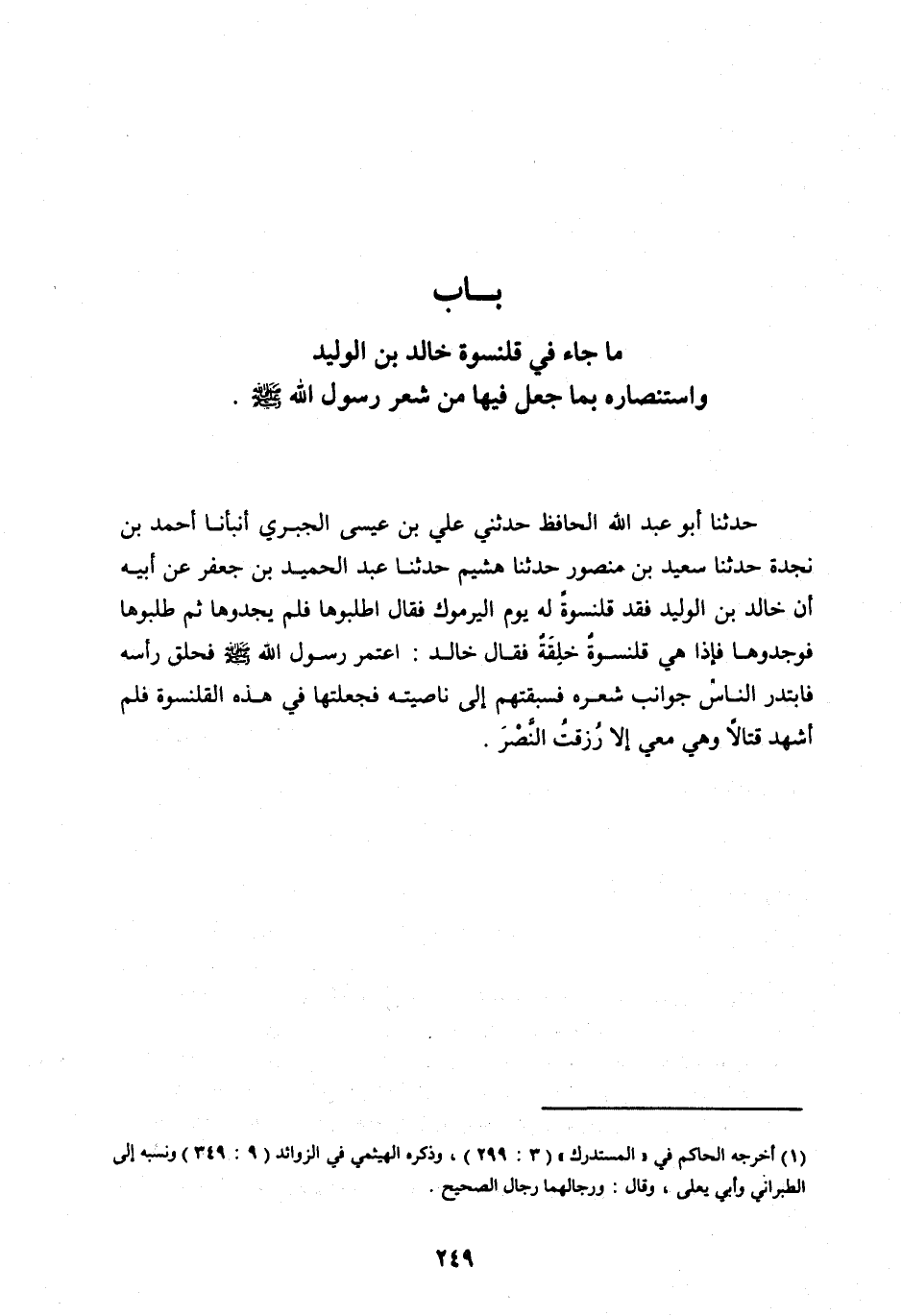 حَدَّثَنَا أَبُو عَبْدِ اللهِ الْحَافِظُ حَدَّثَنِي عَلِيُّ بْنُ عيسى الجبري أَنْبَأَنَا أَحْمَدُ بْنُ نَجْدَةَ حَدَّثَنَا سَعِيدُ بْنُ مَنْصُورٍ حَدَّثَنَا هُشَيْمٌ حَدَّثَنَا عَبْدُ الْحَمِيدِ بْنُ جَعْفَرٍ عَنْ أَبِيهِ أَنَّ خَالِدَ بْنَ الْوَلِيدِ فَقَدَ قَلَنْسُوَةً لَهُ يَوْمَ الْيَرْمُوكِ فَقَالَ اطْلُبُوهَا فَلَمْ يَجِدُوهَا ثُمَّ طَلَبُوهَا فَوَجَدُوهَا فَإِذَا هِيَ قَلَنْسُوَةٌ خَلِقَةٌ فَقَالَ خَالِدٌ: اعْتَمَرَ رَسُولُ اللهِ صَلَّى الله عَلَيْهِ وَسَلَّمَ فَحَلَقَ رَأْسَهُ فَابْتَدَرَ النَّاسُ جَوَانِبَ شَعْرِهِ فَسَبَقْتُهُمْ إِلَى نَاصِيَتِهِ فَجَعَلْتُهَا فِي هَذِهِ الْقَلَنْسُوَةِ فَلَمْ أَشْهَدْ قِتَالًا وَهِيَ مَعِي إلا رزقت النّصر. [ (1) ]