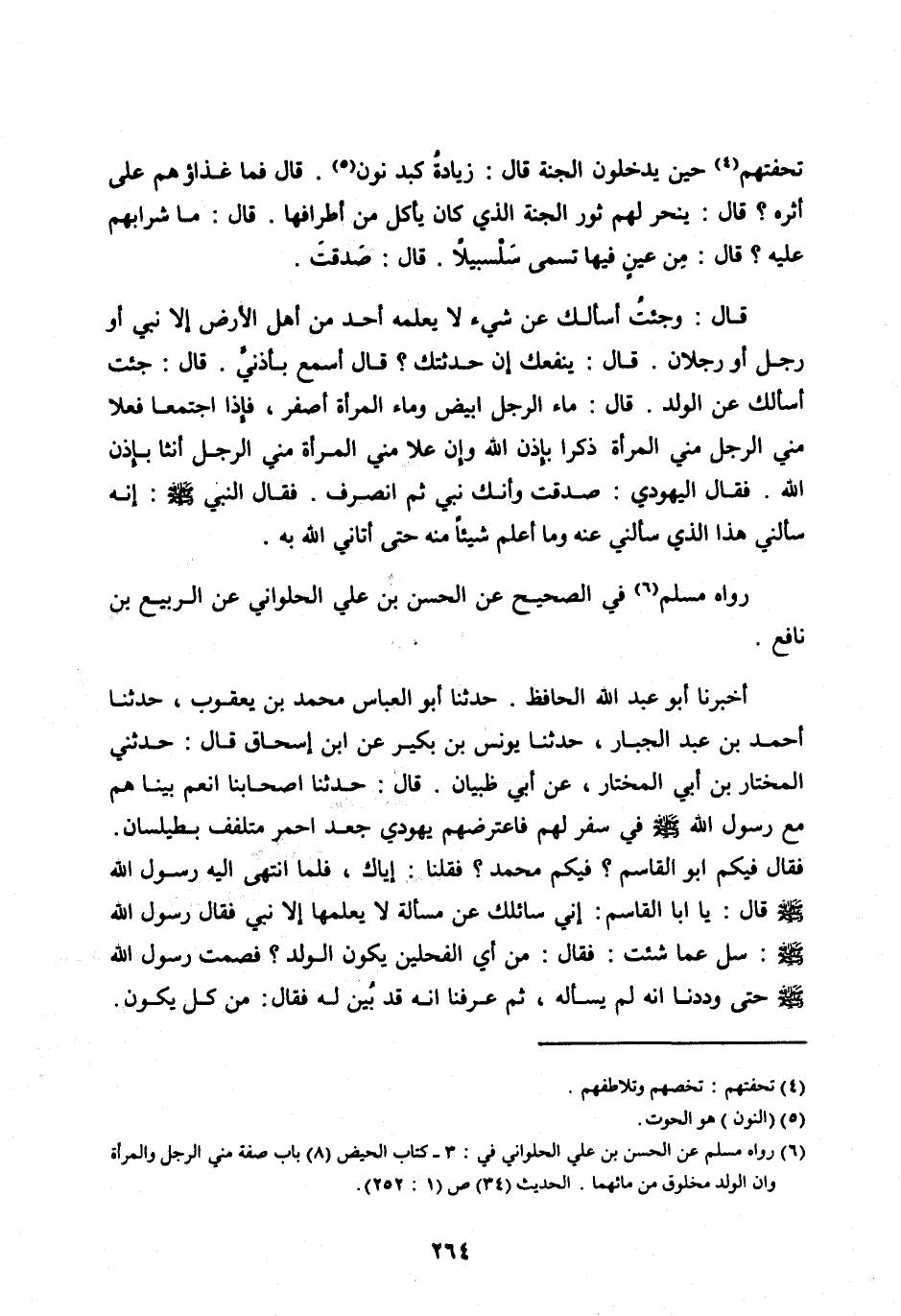 قَالَ: وَجِئْتُ أَسْأَلُكَ عَنْ شَيْءٍ لَا يَعْلَمُهُ أَحَدٌ مِنْ أَهْلِ الْأَرْضِ إِلَّا نَبِيٌّ أَوْ رَجُلٌ أَوْ رَجُلَانِ. قَالَ: يَنْفَعُكَ إِنْ حَدَّثْتُكَ؟ قَالَ أَسْمَعُ بِأُذُنِي. قَالَ: جِئْتُ أَسْأَلُكَ عَنِ الْوَلَدِ. قَالَ: مَاءُ الرَّجُلِ أَبْيَضُ وَمَاءُ الْمَرْأَةِ أَصْفَرُ، فَإِذَا اجْتَمَعَا فَعَلَا مَنِيُّ الرَّجُلِ مَنِيَّ الْمَرْأَةِ ذَكَّرَا بِإِذْنِ اللهِ وَإِنْ عَلَا مَنِيُّ الْمَرْأَةِ مَنِيَّ الرَّجُلِ أَنَّثَا بِإِذْنِ اللهِ. فَقَالَ الْيَهُودِيُّ: صَدَقْتَ وَإِنَّكَ نَبِيٌّ ثُمَّ انْصَرَفَ. فَقَالَ النَّبِيُّ صَلَّى اللهُ عليه وسلم: إنه سَأَلَنِي هَذَا الَّذِي سَأَلَنِي عَنْهُ وَمَا أَعْلَمُ شَيْئًا مِنْهُ حَتَّى أَتَانِيَ اللهُ بِهِ.
