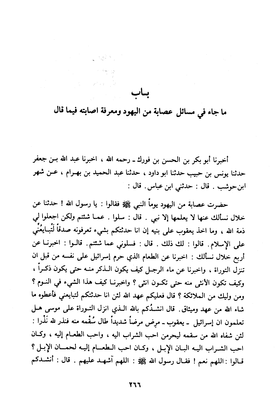 أَخْبَرَنَا أَبُو بَكْرِ بْنُ الْحَسَنِ بْنِ فُورَكٍ- رَحِمَهُ اللهُ، أَخْبَرَنَا عَبْدُ اللهِ بْنُ جَعْفَرٍ حَدَّثَنَا يُونُسُ بْنُ حَبِيبٍ حَدَّثَنَا أَبُو دَاوُدَ، حَدَّثَنَا عَبْدُ الْحَمِيدِ بْنُ بَهْرَامَ، عَنْ شَهْرِ ابن حَوْشَبٍ. قَالَ: حَدَّثَنِي ابْنُ عَبَّاسٍ. قَالَ: حَضَرَتْ عِصَابَةٌ مِنَ الْيَهُودِ يَوْمًا النَّبِيَّ صَلَّى اللهُ عليه وَسَلَّمَ فَقَالُوا: يَا رَسُولَ اللهِ! حَدِّثْنَا عَنْ خِلَالٍ نَسْأَلُكُ عَنْهَا لَا يَعْلَمُهَا إِلَّا نَبِيٌّ. قَالَ: سَلُوا. عَمَّا شِئْتُمْ وَلَكِنِ اجْعَلُوا لِي ذِمَّةَ اللهِ، وَمَا أَخَذَ يَعْقُوبُ عَلَى بَنِيهِ إِنْ أَنَا حَدَّثْتُكُمْ بِشَيْءٍ تَعْرِفُونَهُ صِدْقًا لَتُبَايِعُنِّي عَلَى الْإِسْلَامِ. قَالُوا: لَكَ ذَلِكَ. قَالَ: فَسَلُونِي عَمَّا شِئْتُمْ. قَالُوا: أَخْبِرْنَا عَنْ أَرْبَعِ خِلَالٍ نَسْأَلُكَ: أَخْبِرْنَا عَنِ الطَّعَامِ الَّذِي حَرَّمَ إِسْرَائِيلُ عَلَى نَفْسِهِ مِنْ قَبْلِ أَنْ تُنَزَّلَ التَّوْرَاةُ، وَأَخْبِرْنَا عَنْ مَاءِ الرَّجُلِ كَيْفَ يَكُونُ الذَّكَرُ مِنْهُ حَتَّى يَكُونَ ذَكَرًا، وَكَيْفَ تَكُونُ الْأُنْثَى مِنْهُ حَتَّى تَكُونَ أُنْثَى؟ وَأَخْبِرْنَا كَيْفَ هَذَا الشَّيْءُ فِي النَّوْمِ؟