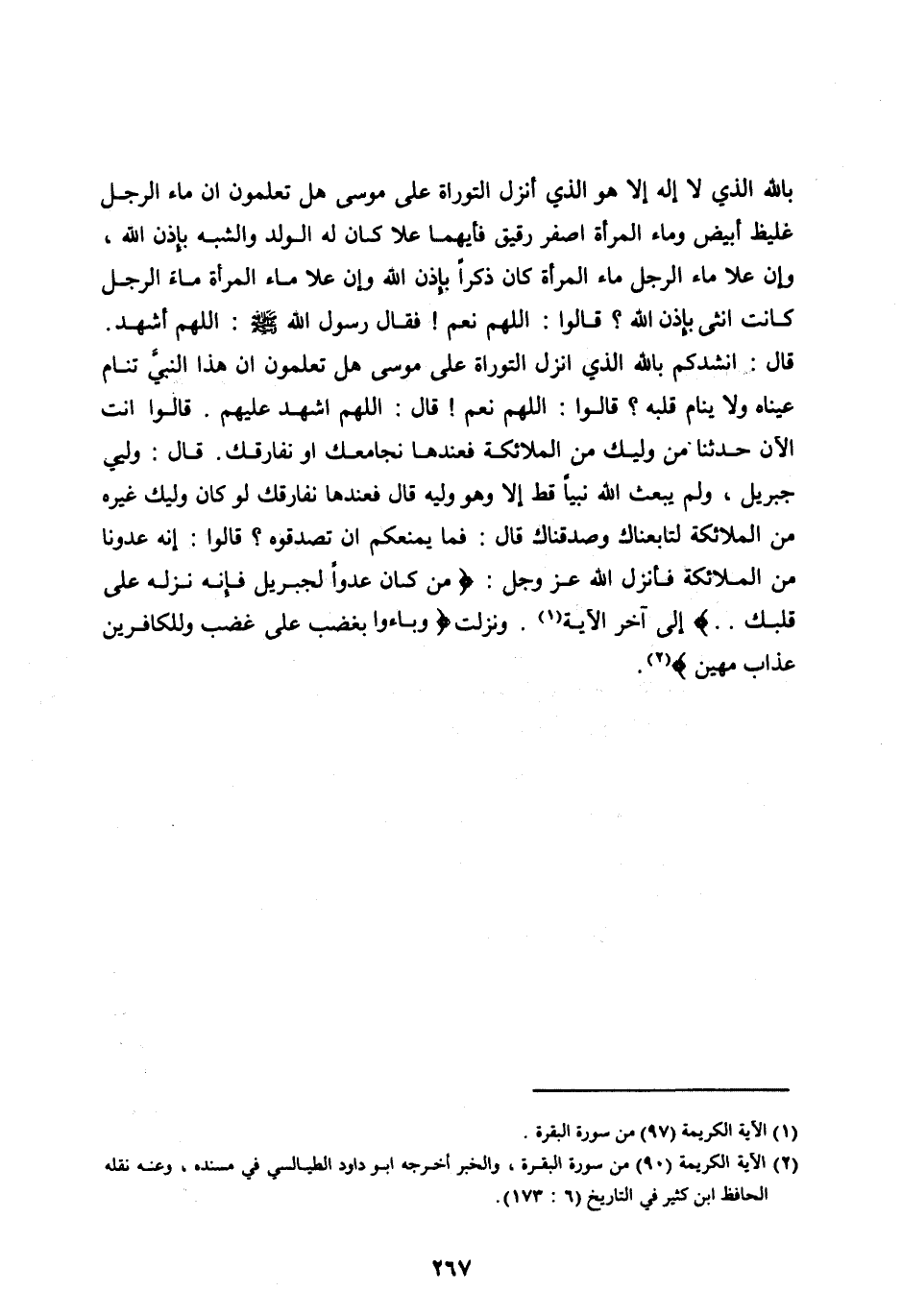 قَالَ: أَنْشُدُكُمْ بِاللهِ الَّذِي أَنْزَلَ التَّوْرَاةَ عَلَى مُوسَى هَلْ تَعْلَمُونَ أَنَّ هَذَا النَّبِيَّ تَنَامُ عَيْنَاهُ وَلَا يَنَامُ قَلْبُهُ؟ قَالُوا: اللهُمَّ نَعَمْ! قَالَ: اللهُمَّ اشْهَدْ عَلَيْهِمْ. قَالُوا أَنْتَ الْآنَ حَدِّثْنَا مَنْ وَلِيِّكَ مِنَ الْمَلَائِكَةِ فَعِنْدَهَا نُجَامِعُكَ أَوْ نُفَارِقُكَ. قَالَ: وَلِيِّي جِبْرِيلُ، وَلَمْ يَبْعَثُ اللهُ نَبِيًّا قَطُّ إِلَّا وهو وليه قال فَعِنْدَهَا نُفَارِقُكَ لَوْ كَانَ وَلِيُّكَ غَيْرَهُ مِنَ الْمَلَائِكَةِ لَتَابَعْنَاكَ وَصَدَّقْنَاكَ قَالَ: فَمَا يَمْنَعُكُمْ أَنْ تُصَدِّقُوهُ؟ قَالُوا: إِنَّهُ عَدُوُّنَا مِنَ الْمَلَائِكَةِ فَأَنْزَلَ اللهُ عَزَّ وَجَلَّ: مَنْ كانَ عَدُوًّا لِجِبْرِيلَ فَإِنَّهُ نَزَّلَهُ عَلى قَلْبِكَ.. إِلَى آخِرِ الْآيَةِ [ (1) ] . وَنَزَلَتْ فَباؤُ بِغَضَبٍ عَلى غَضَبٍ وَلِلْكافِرِينَ عَذابٌ مُهِينٌ