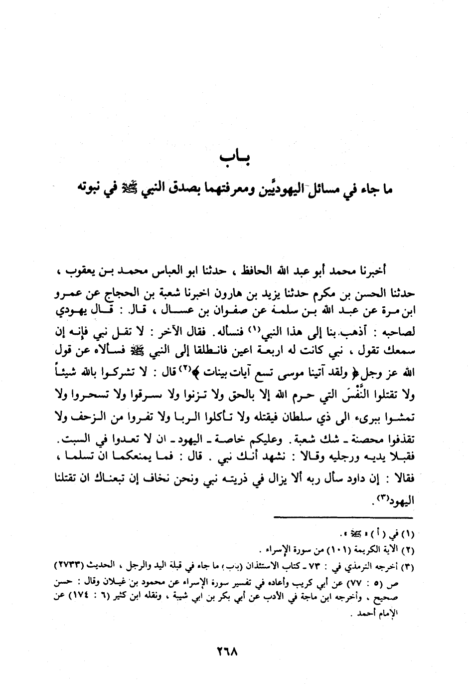 [ (3) ] أخرجه الترمذي في: 73- كتاب الاستئذان (بَابُ) مَا جَاءَ فِي قبلة اليد والرجل، الحديث (2733) ص (5: 77) عن أبي كريب وأعاده في تفسير سورة الإسراء عَنْ مَحْمُودِ بْنِ غَيْلَانَ وقال: حسن صحيح، وأخرجه ابن ماجة في الأدب عَنْ أَبِي بَكْرِ بْنِ ابي شيبة، ونقله ابن كثير (6: 174) عن الإمام أحمد.