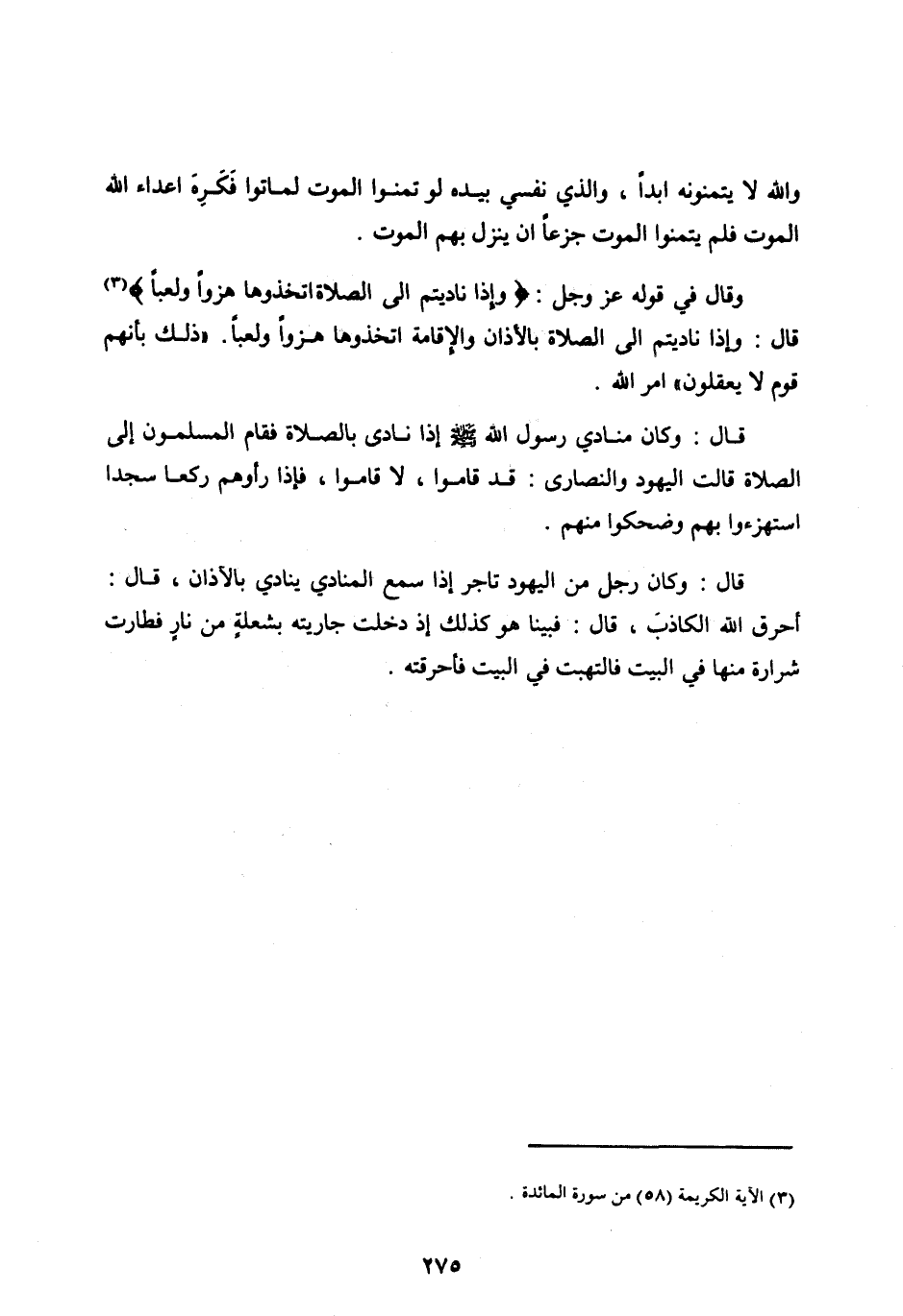 قَالَ: وَكَانَ مُنَادِي رَسُولِ اللهِ صَلَّى اللهُ عَلَيْهِ وَسَلَّمَ إِذْ نَادَى بِالصَّلَاةِ فَقَامَ الْمُسْلِمُونَ إِلَى الصَّلَاةِ قَالَتِ الْيَهُودُ وَالنَّصَارَى: قَدْ قَامُوا، لَا قَامُوا، فَإِذَا رَأَوْهُمْ رُكَّعًا سُجَّدًا اسْتَهْزَءُوا بِهِمْ وَضَحِكُوا مِنْهُمْ.