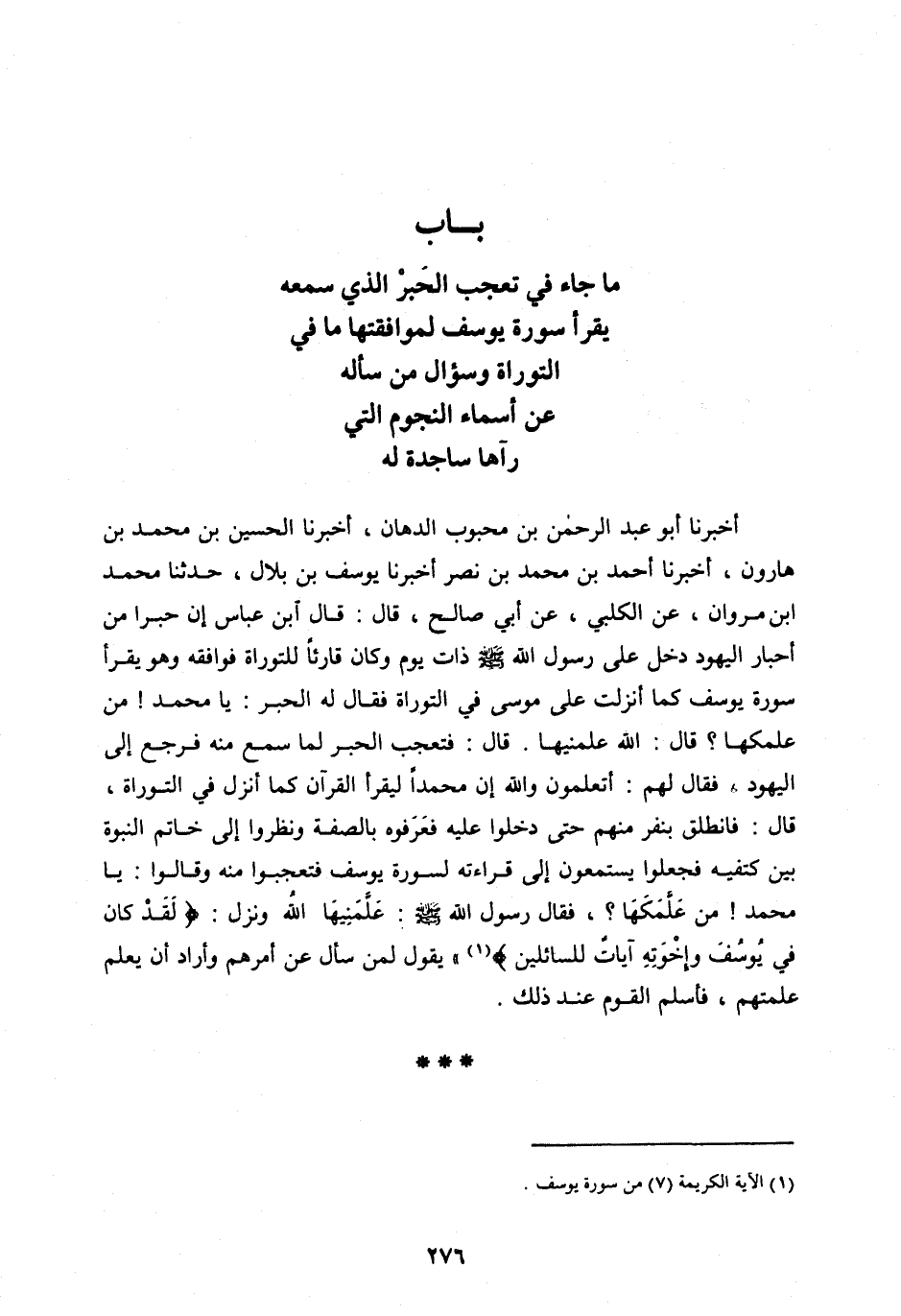 أَخْبَرَنَا أَبُو عَبْدِ الرَّحْمَنِ بْنُ مَحْبُوبٍ الدَّهَّانُ، أَخْبَرَنَا الْحُسَيْنُ بْنُ مُحَمَّدِ بْنِ هَارُونَ، أَخْبَرَنَا أَحْمَدُ بْنُ مُحَمَّدِ بْنِ نَصْرٍ أَخْبَرَنَا يُوسُفُ بْنُ بِلَالٍ، حدثنا محمد ابن مَرْوَانَ، عَنِ الْكَلْبِيِّ، عَنْ أَبِي صَالِحٍ، قَالَ: قَالَ ابْنُ عَبَّاسٍ إِنَّ حَبْرًا مِنْ أَحْبَارِ الْيَهُودِ دَخَلَ عَلَى رَسُولِ اللهِ صَلَّى اللهُ عَلَيْهِ وَسَلَّمَ ذَاتَ يَوْمٍ وَكَانَ قَارِئًا لِلْتَوْرَاةِ فَوَافَقَهُ وَهُوَ يَقْرَأُ سُورَةَ يُوسُفَ كَمَا أُنْزِلَتْ عَلَى مُوسَى فِي التَّوْرَاةِ فَقَالَ لَهُ الْحَبْرُ: يَا مُحَمَّدُ! مَنْ عَلَّمَكَهَا؟ قَالَ: اللهُ عَلَّمَنِيهَا. قَالَ: فَتَعَجَّبَ الْحَبْرُ لِمَا سَمِعَ مِنْهُ فَرَجَعَ إِلَى الْيَهُودِ، فَقَالَ لَهُمْ: أَتَعْلَمُونَ وَاللهِ إِنَّ مُحَمَّدًا لَيَقْرَأُ الْقُرْآنَ كَمَا أُنْزِلَ فِي التَّوْرَاةِ، قَالَ: فَانْطَلَقَ بِنَفَرٍ مِنْهُمْ حَتَّى دَخَلُوا عَلَيْهِ فَعَرَفُوهُ بِالصِّفَةِ وَنَظَرُوا إِلَى خَاتَمِ النُّبُوَّةِ بَيْنَ كَتِفَيْهِ فَجَعَلُوا يَسْتَمِعُونَ إِلَى قِرَاءَتِهِ لِسُورَةِ يُوسُفَ فَتَعَجَّبُوا مِنْهُ وَقَالُوا: يَا مُحَمَّدُ! مَنْ عَلَّمَكَهَا؟ فَقَالَ رَسُولُ اللهِ صَلَّى الله عليه وَسَلَّمَ: عَلَّمَنِيهَا اللهُ وَنَزَلَ: لَقَدْ كانَ فِي يُوسُفَ وَإِخْوَتِهِ آياتٌ لِلسَّائِلِينَ [ (1) ] » يَقُولُ لِمَنْ سَأَلَ عَنْ أَمْرِهِمْ وَأَرَادَ أَنْ يَعْلَمَ علمتهم، فَأَسْلَمَ الْقَوْمُ عِنْدَ ذَلِكَ.
