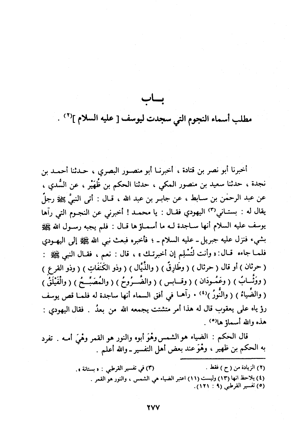 أَخْبَرَنَا أَبُو نَصْرِ بْنُ قَتَادَةَ، أَخْبَرَنَا أَبُو مَنْصُورٍ الْبَصْرِيُّ، حَدَّثَنَا أَحْمَدُ بْنُ نَجْدَةَ، حَدَّثَنَا سَعِيدُ بْنُ مَنْصُورٍ الْمَكِّيُّ، حَدَّثَنَا الْحَكَمُ بْنُ ظُهَيْرٍ، عَنِ السُّدِّيِّ، عَنْ عَبْدِ الرَّحْمَنِ بْنِ سَابِطٍ، عَنْ جَابِرِ بْنِ عَبْدِ اللهِ، قَالَ: أَتَى النَّبِيَّ صَلَّى اللهُ عَلَيْهِ وَسَلَّمَ رَجُلٌ يُقَالُ لَهُ: بُسْتَانِيٌّ [ (3) ] الْيَهُودِيِّ فَقَالَ: يَا مُحَمَّدُ! أَخْبِرْنِي عَنِ النُّجُومِ الَّتِي رَآهَا يُوسُفُ عَلَيْهِ السَّلَامُ أَنَّهَا سَاجِدَةً لَهُ مَا أَسْمَاؤُهَا قَالَ: فَلَمْ يُجِبْهُ رَسُولُ اللهِ صَلَّى اللهُ عليه وسلم بِشَيْءٍ فَنَزَلَ عَلَيْهِ جِبْرِيلُ- عَلَيْهِ السَّلَامُ-، فَأَخْبَرَهُ فَبَعَثَ نبي الله صلى الله عَلَيْهِ وَسَلَّمَ إِلَى الْيَهُودِيِّ فَلَمَّا جَاءَهُ قَالَ: «وَأَنْتَ لَتُسْلِمْ إِنْ أَخْبَرْتُكَ» ، قَالَ: نَعَمْ، فَقَالَ النَّبِيُّ صَلَّى اللهُ عَلَيْهِ وَسَلَّمَ: