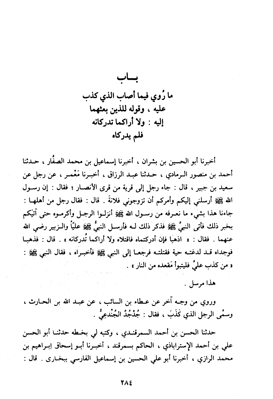 جَاءَنَا هَذَا بِشَيْءٍ مَا نَعْرِفُهُ مِنْ رَسُولِ اللهِ صَلَّى اللهُ عَلَيْهِ وَسَلَّمَ أَنْزِلُوا الرَّجُلَ وَأَكْرِمُوهُ حَتَّى آتِيَكُمْ بِخَبَرِ ذَلِكَ فَأَتَى النَّبِيَّ صَلَّى اللهُ عَلَيْهِ وَسَلَّمَ فَذَكَرَ ذَلِكَ لَهُ فَأَرْسَلَ النَّبِيُّ صَلَّى اللهُ عليه وسلم عَلِيًّا وَالزُّبَيْرَ رَضِيَ اللهُ عَنْهُمَا. فَقَالَ: «اذْهَبَا فَإِنْ أَدْرَكْتُمَاهُ فَاقْتَلَاهُ وَلَا أُرَاكُمَا تُدْرِكَانِهِ» . قَالَ: فَذَهَبَا فَوَجَدَاهُ قَدْ لَدَغَتْهُ حَيَّةٌ فَقَتَلْتُهُ فَرَجَعَا إِلَى النَّبِيِّ صَلَّى اللهُ عَلَيْهِ وَسَلَّمَ فَأَخْبَرَاهُ، فَقَالَ النَّبِيُّ صَلَّى اللهُ عَلَيْهِ وَسَلَّمَ: