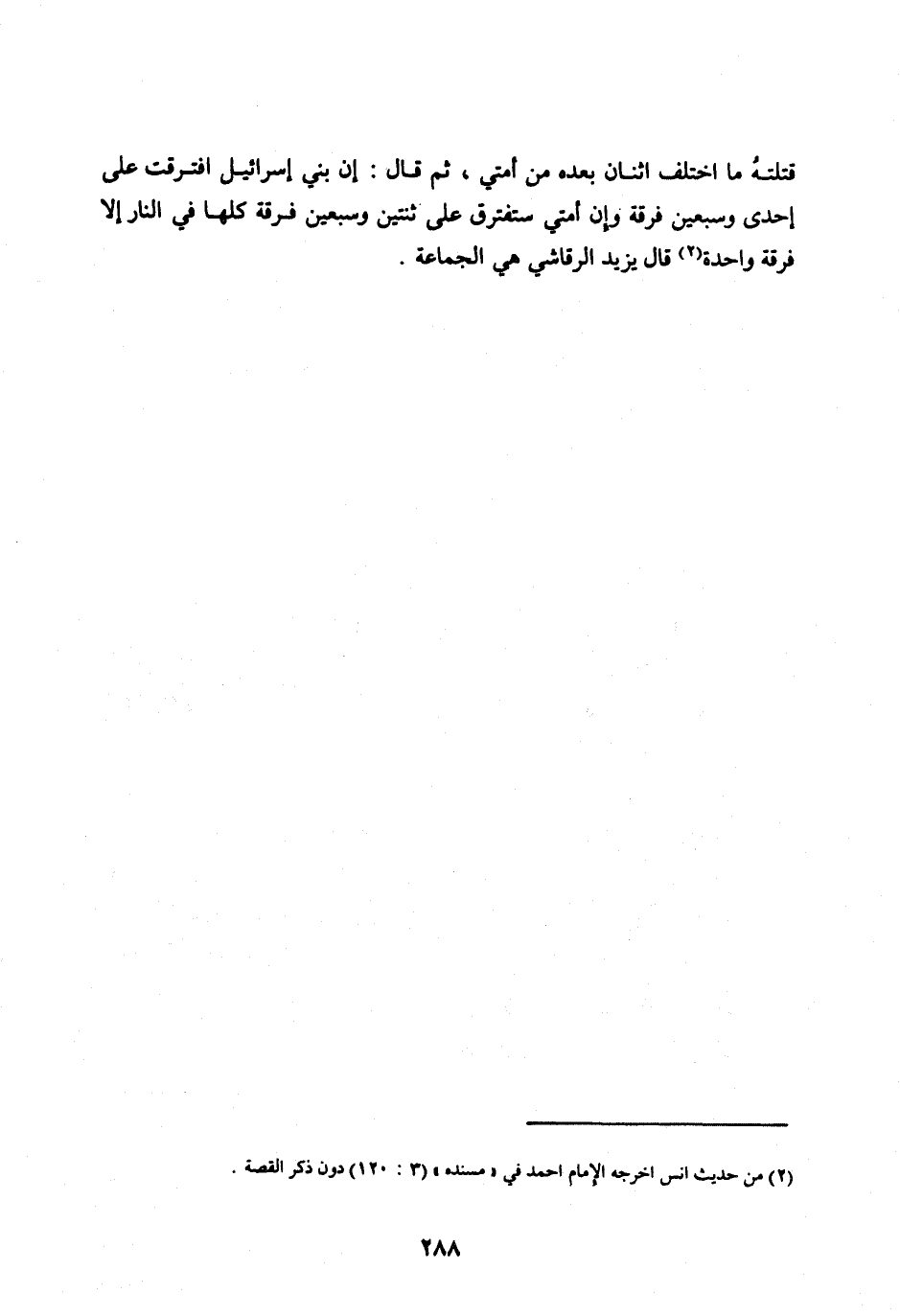 قَتَلْتُهُ مَا اخْتَلَفَ اثْنَانِ بَعْدَهُ مِنْ أُمَّتِي، ثُمَّ قَالَ: إِنَّ بَنِي إِسْرَائِيلَ افْتَرَقَتْ عَلَى إِحْدَى وَسَبْعِينَ فِرْقَةً وَإِنَّ أُمَّتِي سَتَفْتَرِقُ على ثنتين وَسَبْعِينَ فِرْقَةً كُلَّهَا فِي النَّارِ إِلَّا فِرْقَةً وَاحِدَةً