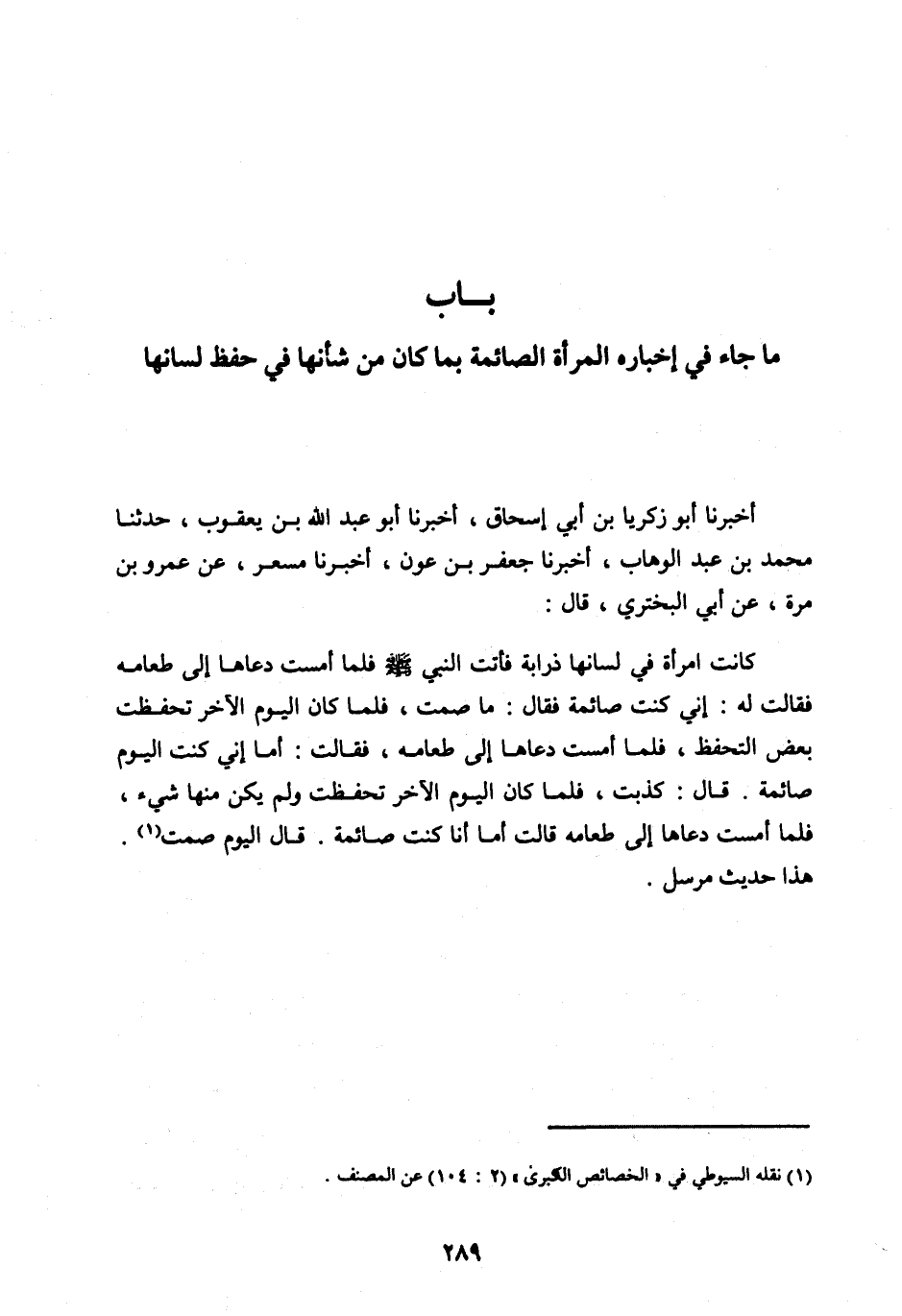 أَخْبَرَنَا أَبُو زَكَرِيَّا بْنُ أَبِي إِسْحَاقَ، أَخْبَرَنَا أَبُو عَبْدِ اللهِ بْنُ يَعْقُوبَ، حَدَّثَنَا مُحَمَّدُ بْنُ عَبْدِ الْوَهَّابِ، أَخْبَرَنَا جَعْفَرُ بْنُ عَوْنٍ، أَخْبَرَنَا مِسْعَرٌ، عَنْ عَمْرِو بْنِ مُرَّةَ، عَنْ أَبِي الْبَخْتَرِيِّ، قَالَ: كَانَتِ امْرَأَةٌ فِي لِسَانِهَا ذَرَابَةً فَأَتَتِ النَّبِيَّ صلى الله عليه وسلم فَلَمَّا أَمْسَتْ دَعَاهَا إِلَى طَعَامِهِ فَقَالَتْ لَهُ: إِنِّي كُنْتُ صَائِمَةً فَقَالَ: مَا صُمْتِ، فَلَمَّا كَانَ الْيَوْمُ الْآخَرُ تَحَفَّظَتْ بَعْضَ التَّحَفُّظِ، فَلَمَّا أَمْسَتْ دَعَاهَا إِلَى طَعَامِهِ، فَقَالَتْ: أَمَا إِنِّي كُنْتُ الْيَوْمَ صَائِمَةً. قَالَ: كَذَبْتِ، فَلَمَّا كَانَ الْيَوْمُ الْآخَرُ تَحَفَّظَتْ وَلَمْ يَكُنْ مِنْهَا شَيْءٌ، فَلَمَّا أَمْسَتْ دَعَاهَا إِلَى طَعَامِهِ قَالَتْ أَمَّا أَنَا كُنْتُ صَائِمَةً. قَالَ الْيَوْمَ صُمْتِ