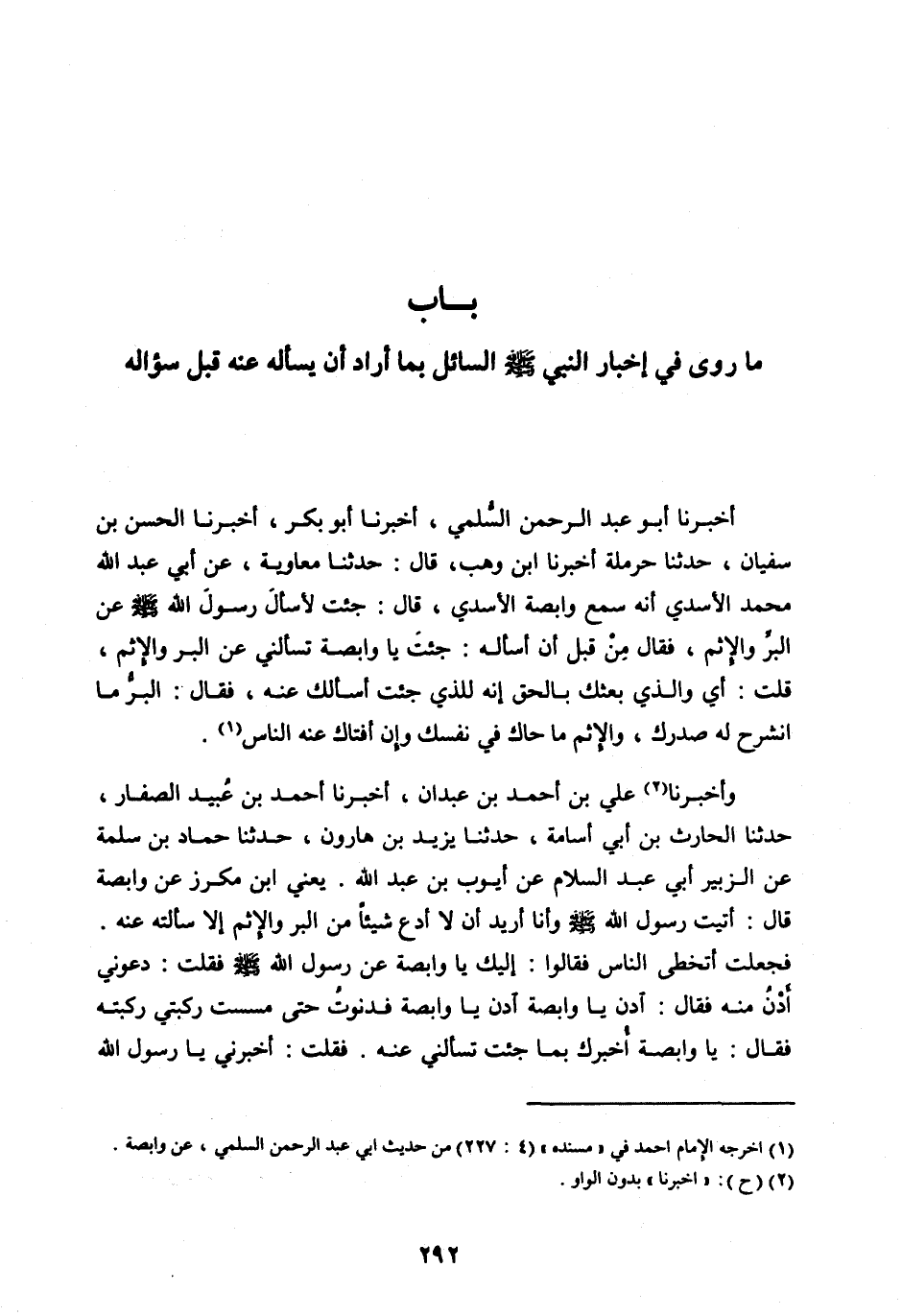 فَجَعَلْتُ أَتَخَطَّى النَّاسَ فَقَالُوا: إِلَيْكَ يَا وَابِصَةُ عَنْ رَسُولِ اللهِ صَلَّى اللهُ عَلَيْهِ وَسَلَّمَ فَقُلْتُ: دَعُونِي أَدْنُ مِنْهُ فَقَالَ: ادْنُ يَا وَابِصَةُ ادْنُ يَا وَابِصَةُ فَدَنَوْتُ حَتَّى مَسَسْتُ رُكْبَتِي رُكْبَتَهُ فَقَالَ: يَا وَابِصَةَ أُخْبِرُكَ بِمَا جِئْتَ تَسْأَلُنِي عَنْهُ. فَقُلْتُ: أَخْبِرْنِي يَا رَسُولَ اللهِ