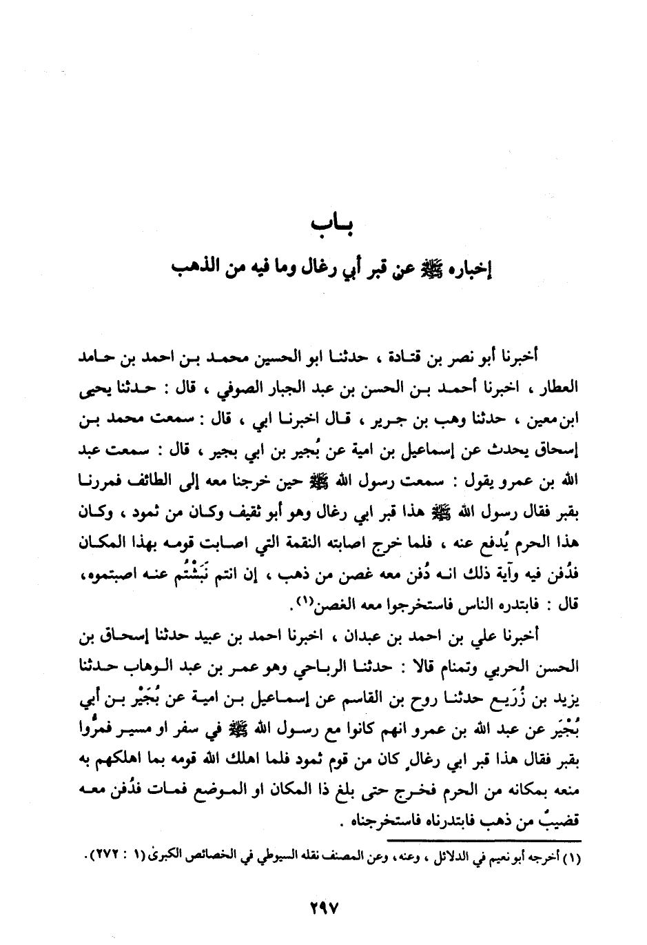 أَخْبَرَنَا أَبُو نَصْرِ بْنُ قَتَادَةَ، حَدَّثَنَا أَبُو الْحُسَيْنِ مُحَمَّدُ بْنُ أَحْمَدَ بْنِ حَامِدٍ الْعَطَّارُ، أَخْبَرَنَا أَحْمَدُ بْنُ الْحَسَنِ بْنِ عَبْدِ الْجَبَّارِ الصُّوفِيُّ، قَالَ: حَدَّثَنَا يَحْيَى ابن مَعِينٍ، حَدَّثَنَا وَهْبُ بْنُ جَرِيرٍ، قَالَ أَخْبَرَنَا أَبِي، قَالَ: سَمِعْتُ مُحَمَّدَ بْنَ إِسْحَاقَ يُحَدِّثُ عَنْ إِسْمَاعِيلَ بْنِ أُمَيَّةَ عَنْ بُجَيْرِ بْنِ أَبِي بُجَيْرٍ، قَالَ: سَمِعْتُ عَبْدَ اللهِ بْنَ عَمْرٍو يَقُولُ: سَمِعْتُ رَسُولَ اللهِ صَلَّى اللهُ عَلَيْهِ وَسَلَّمَ حِينَ خَرَجْنَا مَعَهُ إِلَى الطَّائِفِ فَمَرَرْنَا بِقَبْرٍ فَقَالَ رَسُولُ اللهِ صَلَّى اللهُ عَلَيْهِ وَسَلَّمَ هَذَا قَبْرُ أَبِي رِغَالٍ وَهُوَ أَبُو ثَقِيفٍ وَكَانَ مِنْ ثَمُودَ، وَكَانَ هَذَا الْحَرَمُ يَدْفَعُ عَنْهُ، فَلَمَّا خَرَجَ أَصَابَتْهُ النِّقْمَةُ الَّتِي أَصَابَتْ قَوْمُهُ بِهَذَا الْمَكَانِ فَدُفِنَ فِيهِ وَآيَةُ ذَلِكَ أَنَّهُ دُفِنَ مَعَهُ غُصْنٌ مِنْ ذَهَبَ، إِنْ أَنْتُمْ نَبَشْتُمْ عَنْهُ أَصَبْتُمُوهُ، قَالَ: فَابْتَدَرَهُ النَّاسُ فَاسْتَخْرَجُوا مَعَهُ الْغُصْنَ