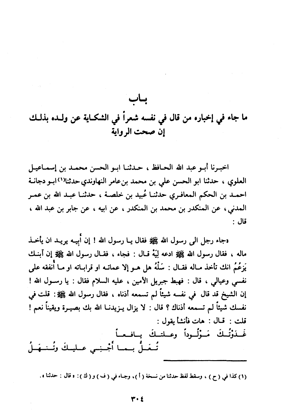 أَخْبَرَنَا أَبُو عَبْدِ اللهِ الْحَافِظُ، حَدَّثَنَا أَبُو الْحَسَنُ مُحَمَّدُ بْنُ إِسْمَاعِيلَ الْعَلَوِيُّ، حَدَّثَنَا أَبُو الْحَسَنِ عَلِيُّ بْنُ مُحَمَّدِ بْنِ عَامِرٍ النَّهَاوَنْدِيُّ حَدَّثَنَا [ (1) ] أَبُو دُجَانَةَ أَحْمَدُ بْنُ الْحَكَمِ الْمَعَافِرِيُّ حَدَّثَنَا عُبَيْدُ بْنُ خَلَصَةَ، حَدَّثَنَا عَبْدُ اللهِ بْنُ عُمَرَ الْمَدَنِيُّ، عَنِ الْمُنْكَدِرِ بْنِ مُحَمَّدِ بْنِ الْمُنْكَدِرِ، عَنْ أَبِيهِ، عَنْ جَابِرِ بْنِ عَبْدِ اللهِ، قَالَ: «جَاءَ رَجُلٌ إِلَى رَسُولِ اللهِ صَلَّى اللهُ عَلَيْهِ وَسَلَّمَ فَقَالَ يَا رَسُولَ اللهِ! إِنَّ أَبِيهِ يُرِيدُ أَنْ يَأْخُذَ مَالَهُ، فَقَالَ رَسُولُ اللهِ صَلَّى الله عليه وسلم ادْعُهُ لِيَهْ قَالَ: فَجَاءَ، فَقَالَ رَسُولُ اللهِ صَلَّى الله عليه وسلم إِنَّ ابْنَكَ يَزْعُمُ أَنَّكَ تَأْخُذُ مَالَهُ فَقَالَ: سَلْهُ هَلْ هُوَ إِلَّا عَمَّاتُهُ أَوْ قَرَابَاتُهُ أَوْ مَا أُنْفِقُهُ عَلَى نَفْسِي وَعِيَالِي، قَالَ: فَهَبَطَ جِبْرِيلُ الْأَمِينُ، عَلَيْهِ السَّلَامُ فَقَالَ: يَا رَسُولُ اللهِ! إِنَّ الشَّيْخَ قَدْ قَالَ فِي نَفْسِهِ شَيْئًا لَمْ تَسْمَعْهُ أُذُنَاهُ، فَقَالَ رَسُولُ اللهِ صَلَّى اللهُ عَلَيْهِ وَسَلَّمَ: قُلْتَ فِي نَفْسِكَ شَيْئًا لَمْ تَسْمَعْهُ أُذُنَاكَ؟ قَالَ: لَا يَزَالُ يَزِيدُنَا اللهُ بِكَ بَصِيرَةً وَيَقِينًا نَعَمْ! قُلْتُ: قَالَ: هات فأنشأ يقول: