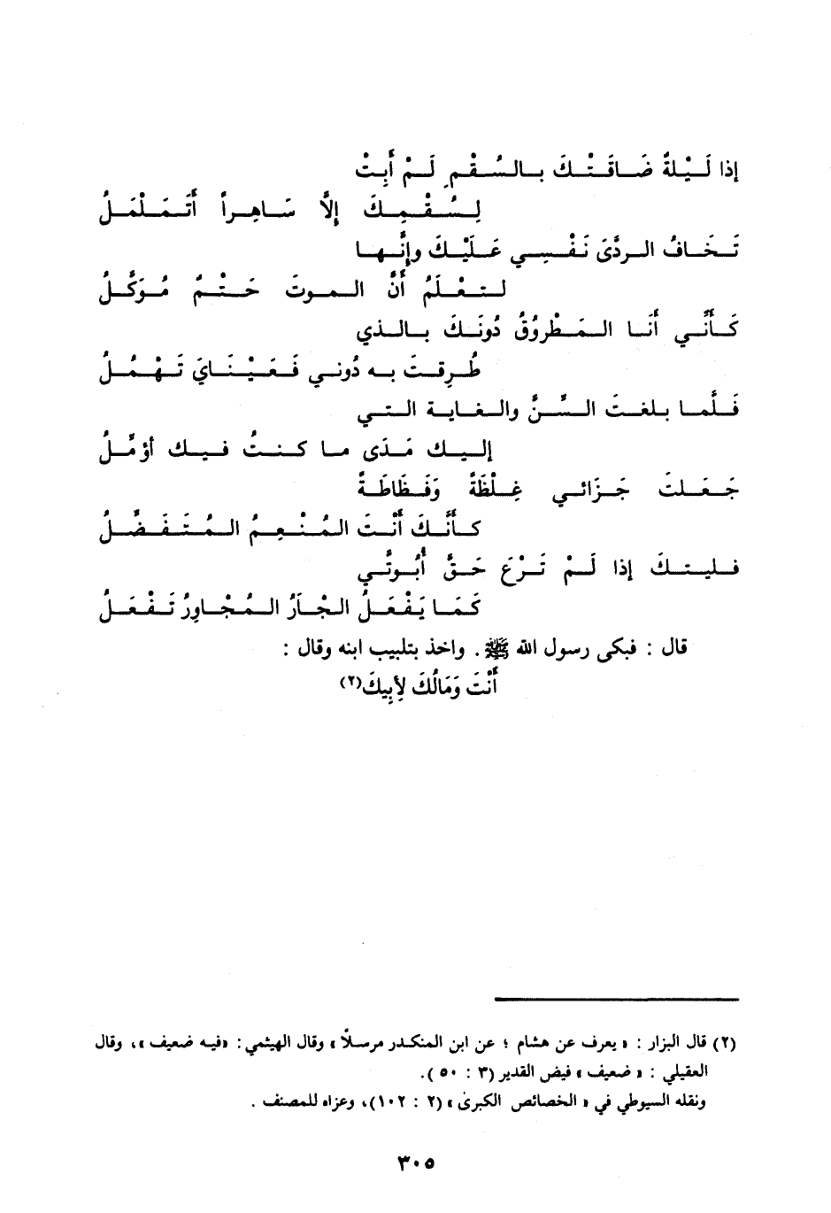 [ (2) ] قال البزار: «يعرف عَنْ هِشَامٍ، عَنِ ابْنِ المنكدر مرسلا» وقال الهيثمي: «فيه ضعيف» ، وقال العقيلي: «ضعيف» فيض القدير (3: 50) .