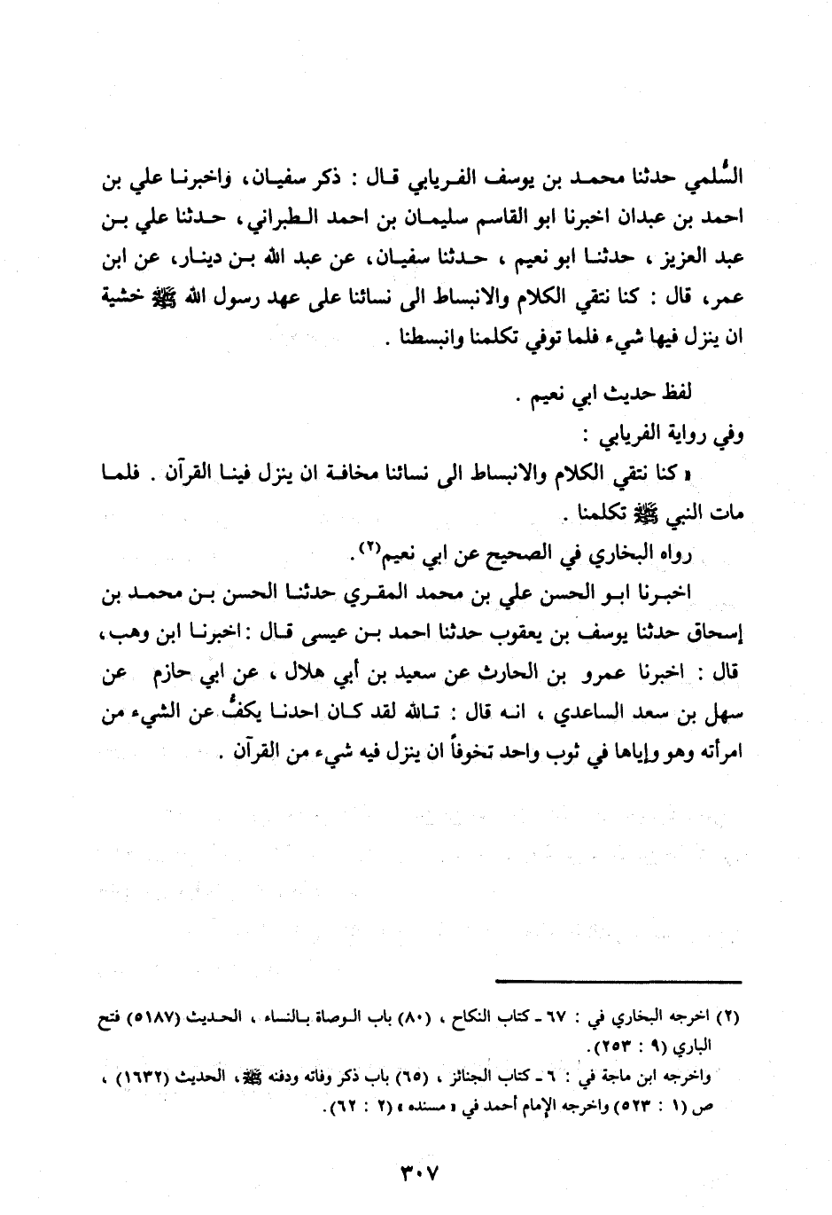 السُّلَمِيُّ حَدَّثَنَا مُحَمَّدُ بْنُ يُوسُفَ الْفِرْيَابِيُّ قَالَ: ذَكَرَ سفيان، وَأَخْبَرَنَا عَلِيُّ بْنُ أَحْمَدَ بْنِ عَبْدَانَ أَخْبَرَنَا أَبُو الْقَاسِمِ سُلَيْمَانُ بْنُ أَحْمَدَ الطَّبَرَانِيُّ، حَدَّثَنَا عَلِيُّ بْنُ عَبْدِ الْعَزِيزِ، حَدَّثَنَا أَبُو نُعَيْمٍ، حَدَّثَنَا سُفْيَانُ، عَنْ عَبْدِ اللهِ بْنِ دِينَارٍ، عَنِ ابْنِ عُمَرَ، قَالَ: كُنَّا نَتَّقِي الْكَلَامَ وَالِانْبِسَاطَ إِلَى نِسَائِنَا عَلَى عَهْدِ رَسُولِ اللهِ صَلَّى اللهُ عَلَيْهِ وَسَلَّمَ خَشْيَةَ أَنْ يَنْزِلَ فِيهَا شَيْءٌ فَلَمَّا تُوُفِّيَ تَكَلَّمْنَا وَانْبَسَطْنَا.
