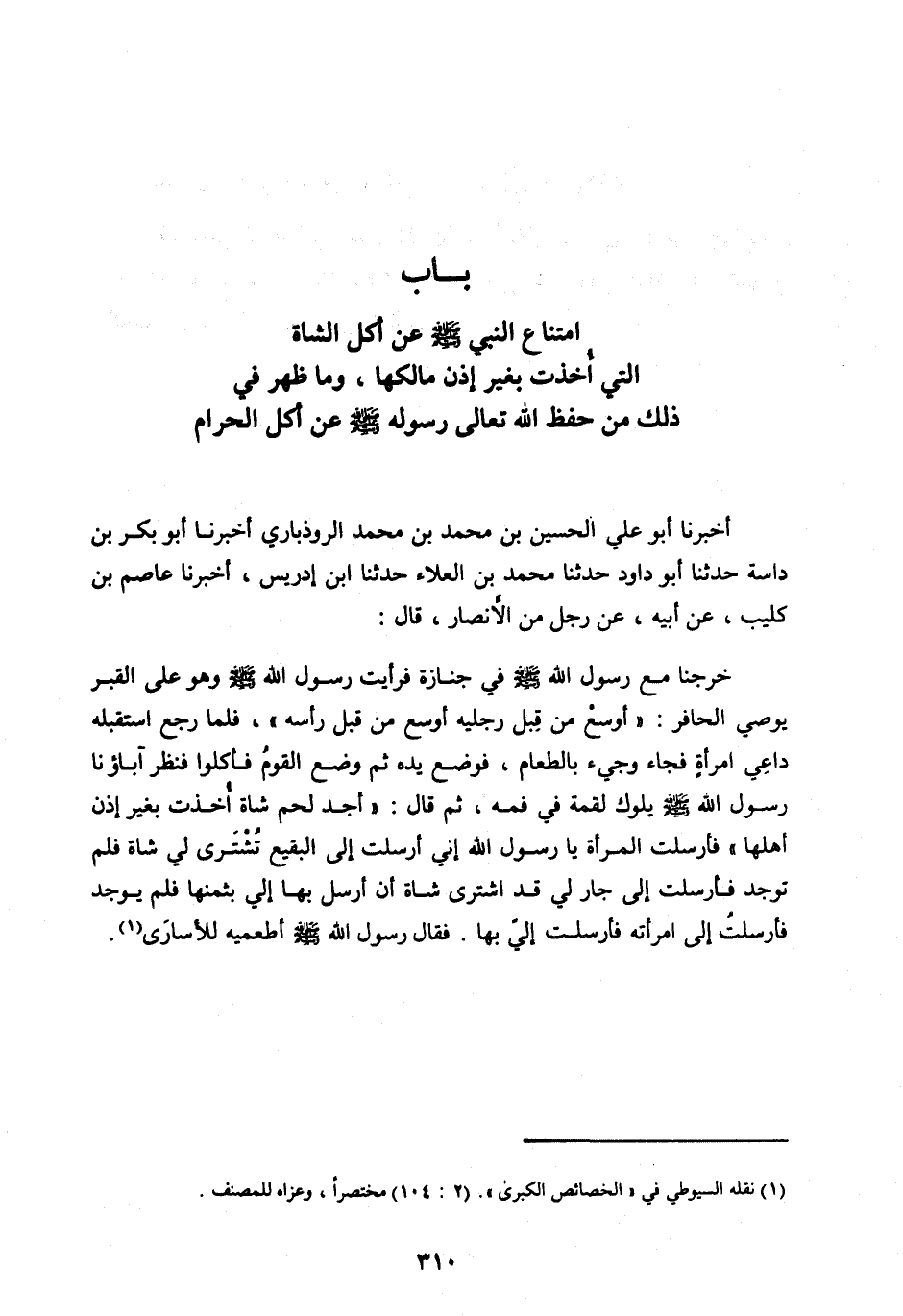 بَابُ امْتِنَاعِ النَّبِيِّ صَلَّى الله عليه وسلم عَنْ أَكْلِ الشَّاةِ الَّتِي أُخِذَتْ بِغَيْرِ إِذْنِ مَالِكِهَا، وَمَا ظَهَرَ فِي ذَلِكَ مِنْ حِفْظِ اللهِ تَعَالَى رَسُولَهُ صَلَّى اللهُ عَلَيْهِ وسلم عَنْ أَكْلِ الْحَرَامِ