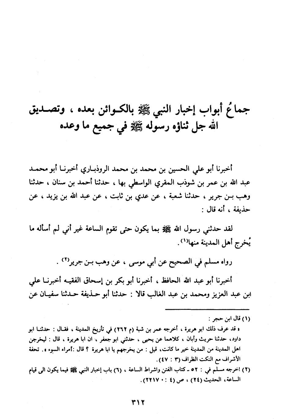 جُمَّاعُ أَبْوَابِ إِخْبَارِ النَّبِيِّ صَلَّى اللهُ عَلَيْهِ وسلم بِالْكَوَائِنِ بَعْدَهُ، وَتَصْدِيقِ اللهِ جَلَّ ثَنَاؤُهُ رَسُولَهُ صَلَّى اللهُ عَلَيْهِ وَسَلَّمَ فِي جَمِيعِ مَا وَعْدَهُ