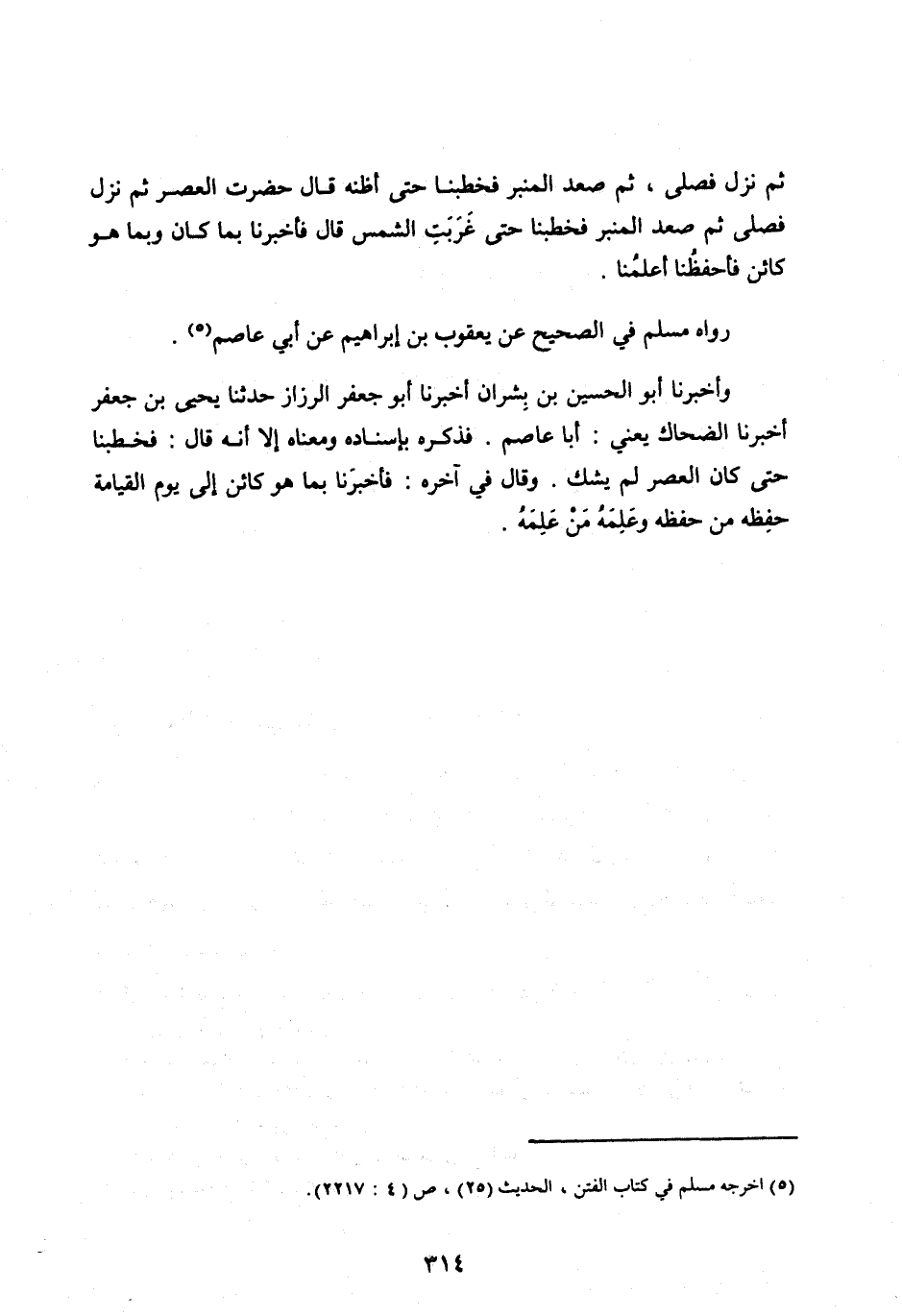 وأَخْبَرَنَا أَبُو الْحُسَيْنِ بْنُ بِشْرَانَ أَخْبَرَنَا أَبُو جَعْفَرٍ الرَّزَّازُ حَدَّثَنَا يَحْيَى بْنُ جَعْفَرٍ أَخْبَرَنَا الضَّحَّاكُ يَعْنِي: أَبَا عَاصِمٍ. فَذَكَرَهُ بِإِسْنَادِهِ وَمَعْنَاهُ إِلَّا أَنَّهُ قَالَ: فَخَطَبَنَا حَتَّى كَانَ الْعَصْرُ لَمْ يَشُكَّ. وَقَالَ فِي آخِرِهِ: فَأَخْبَرَنَا بِمَا هُوَ كَائِنٌ إِلَى يَوْمِ الْقِيَامَةِ حَفِظَهُ مَنْ حَفِظَهُ وَعَلِمَهُ مَنْ عَلِمَهُ.