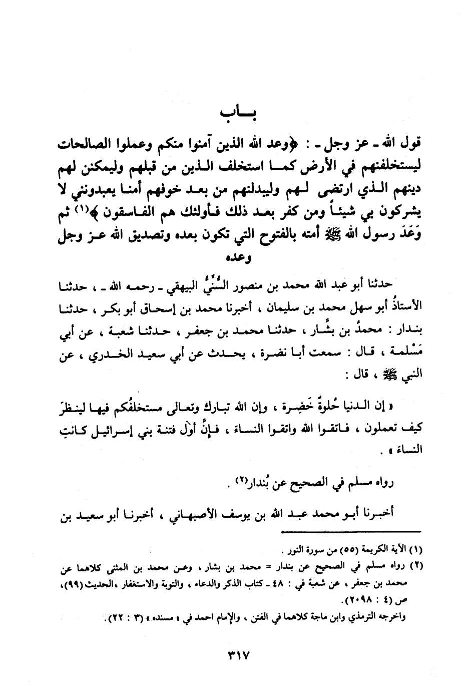 حَدَّثَنَا أَبُو عَبْدِ اللهِ مُحَمَّدُ بْنُ مَنْصُورٍ السُّنِّيِّ الْبَيْهَقِيُّ- رَحِمَهُ اللهُ-، حَدَّثَنَا الْأُسْتَاذُ أَبُو سَهْلٍ مُحَمَّدَ بْنَ سُلَيْمَانَ، أَخْبَرَنَا مُحَمَّدُ بْنُ إِسْحَاقَ أَبُو بَكْرٍ، حَدَّثَنَا بُنْدَارٌ: مُحَمَّدُ بْنُ بَشَّارٍ، حَدَّثَنَا مُحَمَّدُ بْنُ جَعْفَرٍ، حَدَّثَنَا شُعْبَةُ، عَنْ أَبِي مَسْلَمَةَ، قَالَ: سَمِعْتُ أَبَا نَضْرَةَ، يُحَدِّثُ عَنْ أَبِي سَعِيدٍ الْخُدْرِيِّ، عَنِ النَّبِيِّ صَلَّى اللهُ عَلَيْهِ وَسَلَّمَ، قَالَ: «إِنَّ الدُّنْيَا حُلْوَةٌ خَضِرَةٌ، وَإِنَّ اللهَ تَبَارَكَ وَتَعَالَى مُسْتَخْلِفُكُمْ فِيهَا لَيَنْظُرَ كَيْفَ تَعْمَلُونَ، فَاتَّقُوا اللهَ وَاتَّقُوا النِّسَاءَ، فَإِنَّ أَوَّلَ فِتْنَةِ بَنِي إِسْرَائِيلَ كَانَتِ النِّسَاءَ» .