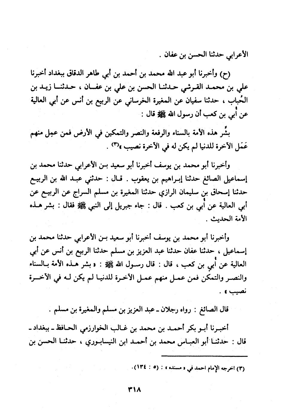 (ح) وأَخْبَرَنَا أَبُو عَبْدِ اللهِ مُحَمَّدُ بْنُ أَحْمَدَ بْنِ أَبِي طَاهِرٍ الدَّقَّاقُ بِبَغْدَادَ أَخْبَرَنَا عَلِيُّ بْنُ مُحَمَّدٍ الْقُرَشِيُّ حَدَّثَنَا الْحَسَنُ بْنُ عَلِيِّ بْنِ عَفَّانَ، حَدَّثَنَا زَيْدُ بْنُ الْحُبَابِ، حَدَّثَنَا سُفْيَانُ عَنِ الْمُغِيرَةِ الْخُرْسَانِيِّ عَنِ الرَّبِيعِ بْنِ أَنَسٍ عَنْ أَبِي الْعَالِيَةِ عَنْ أُبَيِّ بْنِ كَعْبٍ أَنَّ رَسُولَ اللهِ صَلَّى اللهُ عَلَيْهِ وَسَلَّمَ قَالَ: بَشِّرْ هَذِهِ الْأُمَّةَ بِالسَّنَاءِ وَالرِّفْعَةِ وَالنَّصْرِ وَالتَّمْكِينِ فِي الْأَرْضِ فَمَنْ عَمِلَ مِنْهُمْ عَمَلَ الْآخِرَةِ لِلدُّنْيَا لَمْ يَكُنْ لَهُ فِي الْآخِرَةِ نَصِيبٌ» [ (3) ] .